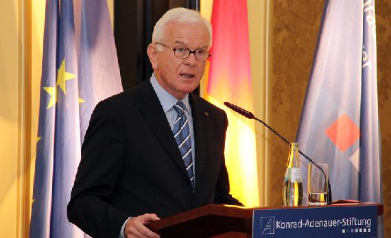 Der KAS-Vorsitzende äußerte zudem sein Bedauern darüber, dass das Bundesverfassungsgericht dem Europäischen Parlament die umfassende Legitimität abspreche. Dies sei zuletzt beim Richterspruch zur Fünf-Prozent-Klausel bei der Wahl zum Europäischen deutlich geworden; das Gericht hatte die Fünf-Prozent-Klausel für verfassungswidrig erklärt. Damit habe das Verfassungsgericht eine Schwächung des Europäischen Parlaments in Kauf genommen, stellte der KAS-Vorsitzende fest. „Man wird dem föderativen System der EU nicht gerecht, wenn man das europäische Parlamentssystem ausschließlich mit dem deutschen parlamentarischen System vergleicht“, argumentierte er. Wünschenswert wäre eine konstruktivere Begleitung der europäischen Integration durch das Bundesverfassungsgericht, sagte Pöttering unter ausdrücklicher Würdigung der Verdienste, die sich das Bundesverfassungsgericht als Förderer und Wächter der Demokratie in Deutschland erworben habe.