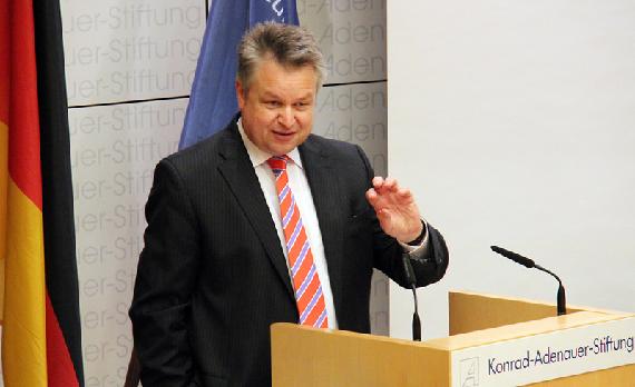 Der Vorsitzende der Konrad-Adenauer-Stiftung und ehemalige Präsident des Europäischen Parlaments, Dr. Hans-Gert Pöttering, setzte sich in seiner Einführung kritisch mit der Rechtsprechung des Bundesverfassungsgerichts zum europäischen Integrationsprozess und zur Rolle der EU-Institutionen, insbesondere der des Europäischen Parlaments auseinander. Pöttering verwies auf das Grundgesetz als „hervorragendes Fundament“ für den weiteren europäischen Ausbau. Bedauerlicherweise sei die Fortsetzung des europäischen Integrationsprozesses jedoch zur Existenzfrage für das Grundgesetz erklärt worden, stellte der Stiftungsvorsitzende fest. Die sogenannte Ewigkeitsklausel im Grundgesetz sei kein Argument gegen, sondern für Europa, betonte Pöttering: „Sie dient dem Schutz fundamentaler deutscher und zugleich europäischer Werte. Mit ihr ist ein Bollwerk gegen Diktatur und Willkürherrschaft geschaffen worden, keine Abwehrmauer gegen die europäische Integration.“