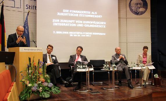 Auf den Panels äußerten sich namhafte Juristen zu verschiedenen rechtlichen Aspekten der Europäischen Integration, unter ihnen der frühere Verfassungsrichter Udo Di Fabio. Der Berichterstatter im Lissabon-Urteil wandte sich auf dem Podium zu den „Spielräumen des Grundgesetzes und Grenzen Karlsruher Rechtsschöpfung“ energisch gegen die von dem Politikwissenschaftler Peter Graf Kielmansegg (Mannheim) ins Spiel gebrachte Idee, vielleicht das Bundesverfassungsgericht mit der Aufgabe zu betrauen, die Entscheidung darüber zu treffen, welche Integrationsschritte durch Volksabstimmung zu legitimieren seien. In eine ähnliche Richtung wies ein Vorschlag des Rechtsprofessors Martin Nettesheim (Tübingen). Nettesheim erinnerte jedoch zugleich daran, dass Probleme wie die Strukturmängel demokratischer Kontrolle der EU nicht dadurch verschwänden, dass eine neue deutsche Verfassung den Bundesstaat Europa zulasse.