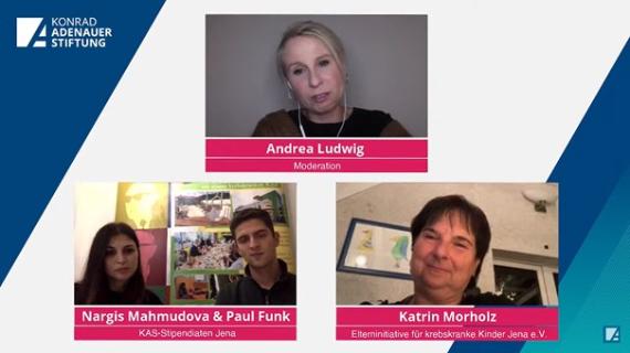 Weihnachten wird gerne im Kreis der Familie verbracht; es stehen die Gemeinsamkeit, Liebe und Freude im Zentrum der Vorweihnachtszeit. Doch auch an Weihnachten gibt es Menschen, die das Fest nicht mit ihrer Familie verbringen können, weil sie krank oder alleine sind und deshalb auf Hilfe angewiesen sind. Zu diesem Thema veranstaltete das Politische Bildungswerk Thüringen einen Livetalk in der Reihe „Reden wir über Familie“ unter dem Titel Für Andere da sein macht glücklich – Ehrenämter zur Weihnachtszeit. Als Gesprächspartner waren Katrin Morholz, Geschäftsführerin Elterninitiative für krebskranke Kinder Jena e.V. (EKK), und Paul Friedrich Funk sowie Nargis Mahmudova, KAS-Stipendiaten Jena, geladen. Moderiert wurde die Veranstaltung von Andrea Ludwig.