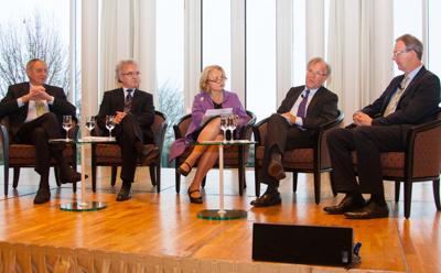 In der anschließenden Diskussionsrunde wurden die deutsch-französischen Beziehungen aus deutscher, französischer und europäischer Perspektive betrachtet. Neben Yves Bur, dem ehemaligen langjährigen Vorsitzenden der deutsch-französischen Parlamentariergruppe, diskutierten Karl Lamers MdB a.D, Prof. Horst Teltschik, ehemaliger außen- und sicherheitspolitischer Berater von Bundeskanzler Helmut Kohl sowie Axel Voss MdEP gemeinsam mit der Moderatorin Dr. Hildegard Stausberg, diplomatische Korrespondentin für Außenpolitik der WELT, über die aktuelle Situation und die Perspektiven der deutsch-französischen Beziehungen.