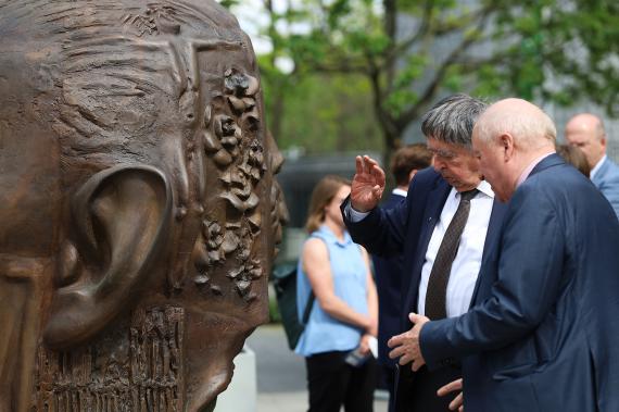 Mit einigen persönlichen Erinnerungen an Berlin und den goldenen, im Zweiten Weltkrieg vorübergehend geschwärzten „Engel“ (Siegesgöttin Viktoria) auf der Siegessäule im Tiergarten leitete Prof. Hubertus von Pilgrim seinen kurzen Vortrag über „Adenauers Kopf“ ein. Im Gegensatz zum Sieges-Engel dürfe ein demokratisches Denkmal nicht überhöht auf einem Sockel stehen, sondern müsse stets in Augenhöhe der Betrachter sein, die eben keine Untertanen seien. Pilgrim berichtete, wie er selbst 1961 Konrad Adenauer in Berlin gesehen habe und von dessen „unglaublicher Präsenz“ fasziniert gewesen sei. Der Gang des damals 85-Jährigen habe ihn erkennen lassen, dass der erste Bundeskanzler jemand gewesen sei, der genau gewusst habe, wo es langgehe – „strukturell preußisch“, diszipliniert. Die Alterszeichnung von Adenauers Gesicht habe in starkem Kontrast zur Lebendigkeit seiner Augen gestanden. Als Schüler von Bernhard Heiliger, der bereits Theodor Heuss und Ludwig Erhard porträtiert hatte, habe Pilgrim beschlossen, die Trias der Persönlichkeiten, deren unterschiedliches Zusammenwirken das „Glück der frühen Bundesrepublik“ gewesen sei, mit einer Kopfplastik von Adenauer zu vervollständigen. Die Gelegenheit dafür habe sich ihm mit dem Wettbewerb der Rhöndorfer Stiftung 1981 geboten. Während die Vorderseite des Werkes der Wiedergabe von Adenauers Gesichtszügen vorbehalten blieb, konnte er den Platz auf dem Hinterkopf für verschiedene Reliefdarstellungen und somit zum symbolischen Erzählen nutzen, wie er später noch direkt am Objekt erläuterte.