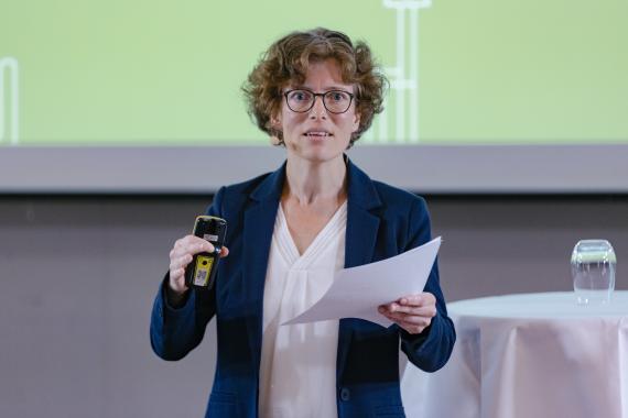 Im Adenauer-Pitch stellten Klima-Experten in kurzer Abfolge innovative kommunale Projekte zur Klimaanpassung vor. Moritz Spielmann erläuterte das Konzept der Grimm Water Solutions UG, einem Freiburger High-Tech-Startup und Innovationstreiber im Bereich Smart Water Cities. Ziel ist die nachhaltige und digitale Transformation der Wasserwirtschaft. Wassersysteme wie Kanalisation und Hochwasserschutz müssen sich aufgrund des Klimawandels und der Urbanisierung anpassen. Das Unternehmen sucht nach Wegen, die Kanalnetze mit Hilfe von Künstlicher Intelligenz zu steuern, um zu verhindern, dass durch Überläufe - beispielsweise bei Starkregen - Schmutzwasser in unsere Wasserkreisläufe fließt.
