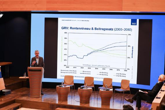 Die Keynote der Veranstaltung hielt der Wirtschaftsweise Prof. Dr. Martin Werding zu den Erfahrungen und Lehren für die Zukunft des Drei-Säulen-Systems in Deutschland. Bezugnehmend auf vielfältige Simulationsszenarien verwies er auf beunruhigende Perspektiven. Ohne Reformen des gegenwärtigen Rentensystems würden vor dem Hintergrund des demographischen Wandels Beitragssätze stetig steigen, das Rentenniveau immer weiter sinken oder aber die Bundeszuschüsse auf 6,5 Prozent des Bruttoinlandsproduktes im Jahr 2060 (gegenüber 2,9% im Jahr 2019, während der gesamte Haushalt etwa 10 Prozent am BIP ausmacht) ansteigen müssen. „Wenn die Umlagefinanzierung durch einen heftigen Alterungsprozess unter Druck gerät, dann muss sie durch kapitalgedeckte Vorsorge ergänzt werden, gerade auch im Hinblick auf Fragen der Generationengerechtigkeit“, ermahnte der Ökonom. Dafür müsse man insbesondere die zweite und dritte Säule in den Blick nehmen, ergänzende Altersvorsorge müsse rentierlicher, verbindlicher und einfacher werden.