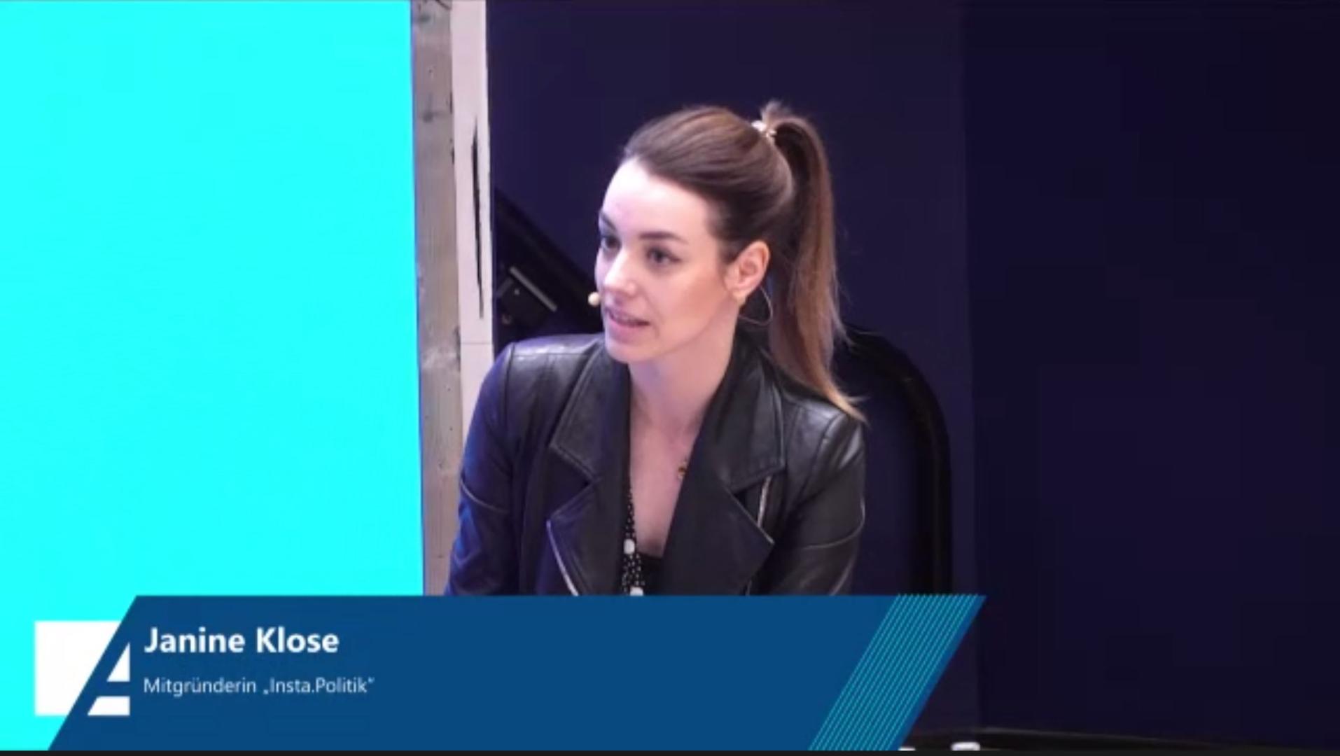 Aus Perspektive der politischen Kommunikation berichtete die Influencerin Janine Klose, Betreiberin des Instagram Accounts „insta.politik“, über die Chancen, welche Politikern über die Kommunikation in sozialen Medien geboten werden. Soziale Medien böten die Möglichkeit, bestimmte Themen gezielt zu kommunizieren und so das Vertrauen in die Politik zu stärken. Gleichzeitig stellten Phänomene wie Hate Speech und Desinformation(-skampagnen) eine große Gefahr im Netz dar.