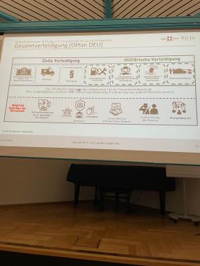 Anhand aktueller Beispiele verdeutlichte der Referent, wie konkret die Gefährdungslage ist: elektronische Störmaßnahmen, Brandanschläge auf Energie- und Verkehrsinfrastruktur oder immense wirtschaftliche Schäden durch Sabotage und Spionage in Milliardenhöhe. Solche Ereignisse zeigen, dass Sicherheit nicht mehr als abstraktes Politikfeld verstanden werden kann, sondern unmittelbare Auswirkungen auf Lieferketten, Produktionsfähigkeit und Vertrauen in Institutionen hat. Die Eskalationsstufen vom Frieden über den Spannungs- bis hin zum Verteidigungsfall machen deutlich: Vorsorge muss vor der Krise beginnen – nicht erst, wenn sie eingetreten ist.