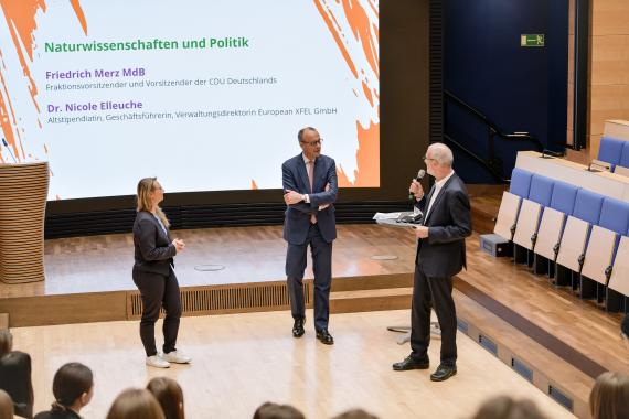 Anschließend beantwortete Friedrich Merz MdB, Vorsitzender der CDU/CSU-Bundestagsfraktion und der CDU Deutschlands, die Fragen der jungen Frauen und diskutierte gemeinsam mit Dr. Nicole Elleuche (Geschäftsführerin und Verwaltungsdirektorin European XFEL) die Fragestellung, was die Wissenschaft von der Politik braucht und vice versa. Friedrich Merz stellte klar: „Wissenschaft und Politik müssen miteinander reden.“ Wissenschaftliche Erkenntnisse und technologischer Fortschritt seien immens wichtig bei der Begegnung aktueller Herausforderungen wie dem Klimawandel.