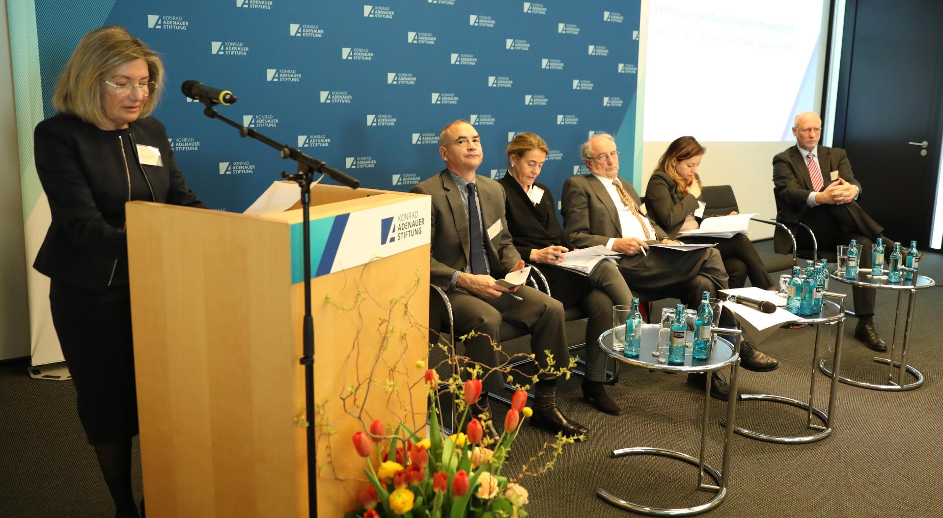 Für die rechtsvergleichenden Vorträge und Debatten waren profilierte italienische, spanische und deutsche Rechtswissenschaftler in der Akademie der Konrad-Adenauer-Stiftung in Berlin zusammengekommen. Wie haben sich die drei Länder auf der Grundlage ihrer Verfassungen entwickelt? Wie steht es um Staat und Gesellschaft? Antworten suchten die Teilnehmer auf Podien mit den Schwerpunkten Entwicklung der Grundrechte, Europäisierung der Rechtsordnungen, Entwicklung des Verwaltungsrechts sowie Föderalismus. Was hat sich bewährt? Wo besteht Handlungs- und Anpassungsbedarf? Trotz jeweils eigener Prägung sind die Verfassungen Italiens, Spaniens und Deutschlands nicht zuletzt aufgrund der europäischen und internationalen Verflechtungen mit ähnlichen politischen und gesellschaftlichen Herausforderungen konfrontiert.