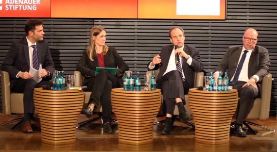 Auf einer Paneldiskussion und Vorstellung des aktuellen Heftes "Syrien" des Debattenmagazins "Die Politische Meinung" wurden diese Themen von drei Experten in der Akademie der Konrad-Adenauer-Stiftung diskutiert. Dr. Fischer-Bollin, stellvertretender Leiter der Hauptabteilung Europäische und Internationale Zusammenarbeit, eröffnete die Veranstaltung. Neben der Autorin des Buches "Der Syrien-Krieg. Lösung eines Weltkonfliktes", Kristin Helberg sprachen der deutscher Diplomat und UNO-Berater Carsten Wieland und der Leiter des Teams Außen-, Sicherheits- und Europapolitik, Nils Wörmer über ihre Erfahrungen, moderiert von Gregor Jaecke, dem Auslandsmitarbeiter der Stiftung für die Länder Syrien und Irak.