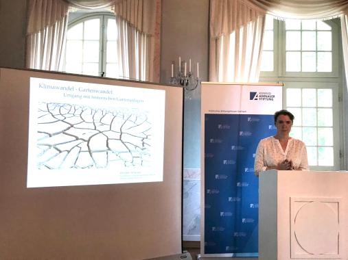 Frau Schwarz begann anschließend mit ihrem Inputvortrag und ging von der Würdigung der Garten- und Parkanlagen über, zu den Problemlagen, bis hin zu den möglichen Lösungsansätzen. Durch intensivere Sonneneinstrahlung, immer spätere Fröste, Hitzewellen, Trockenheit oder die Abwesenheit von Wasser werden die Vegetationsbestände geschwächt. Veranschaulicht wurde dies durch Garten- und Parkanlagen aus Sachsen in der Power Point Präsentation. Zum Beispiel der Park in Nischwitz wurde hervorgehoben, in welchem große ausgewachsene Rotbuchen vertrocknet sind. Auch durch die Massenvermehrung von Käfern kam es in den letzten Jahren zu massiven Baumverlusten. Deshalb wird ein neuer Umgang immer wichtiger und die Ernährung des Bodenlebens, sowie eine bewusstere Wassernutzung gewinnen immer mehr an Bedeutung. Nach Frau Schwarz müssten Gärten nach ihren Risikogebieten klassifiziert werden, um auf diesem Gebit einheitliche Lösungen zu finden. Außerdem müsste eine Würdigung der Parkanlagen geschehen, denn gleichzeitig würden die Gärten aufwändig und kostbarer, sodass ein neues Bewusstsein dafür in der Gesellschaft geschaffen werden muss. Wenn es keine Insekten, kein Wasser und keine Kultur mehr gibt, dann gibt es auch keine Zukunft. Nach ihrer Meinung gibt es kein Erkenntnis-, sondern ein Umsetzungsdefizit.