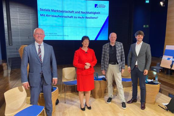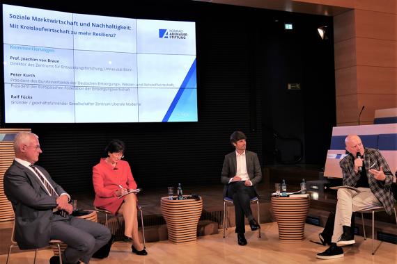In der anschließenden Diskussion ging es unter anderem um das Ausmaß der Produzentenverantwortung, die Rolle der Verbraucher und des Staates (Stichwort öffentliche Auftragsvergabe) sowie mögliche marktbasierte und digitale Instrumente, um die Kreislaufwirtschaft zu stärken. Auch die ministeriale Zuständigkeit für das Voranbringen der Kreislaufwirtschaft und das notwendige Ausmaß an neuen Regulierungen waren Themen der Diskussion. Ungeachtet einzelner Differenzen waren sich die Podiumsteilnehmer einig, dass es für Deutschland möglich sei, ein erfolgreicher Wirtschaftsstandort zu bleiben und dabei die Kreislaufwirtschaft umzusetzen. Dafür müssten vor allem bislang getrennt voneinander entwickelte politische Strategien zusammengedacht werden.