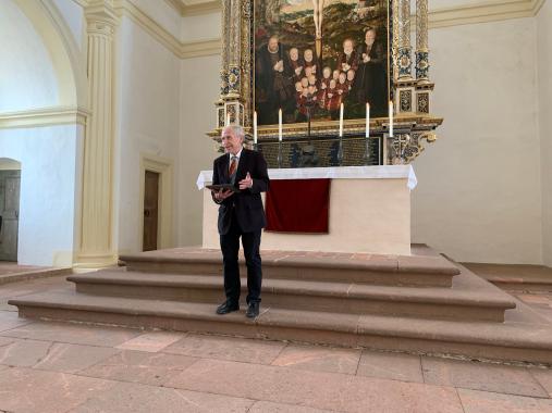 Zunächst fand eine Andacht mit Pfarrer i. R. Uwe Winkler in der Schlosskapelle statt. Pfarrer i. R. Uwe Winkler ging in seiner Andacht auf den Mauerfall und den unveräußerlichen Wert der Freiheit ein. Er bezog sich auf die fortwährend aktuelle Ost/West-Debatte und konkludierte seine Rede mit der Aussage, dass „die Mauer […] auch im Kopf fallen“ müsse.
