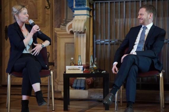 Die vier Referenten auf dem Podium kamen aus vier unterschiedlichen Bereichen der Gesellschaft. Michael Kretschmer vertrat die Politik, Kathrin Kondaurow als Intendantin der Staatsoperette die Kultur, Nadine Schmieder-Galfe die Wissenschaft, und Lars Lehmann die Unternehmenswelt. So setzte sich ein vielfältiges Bild zusammen.