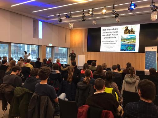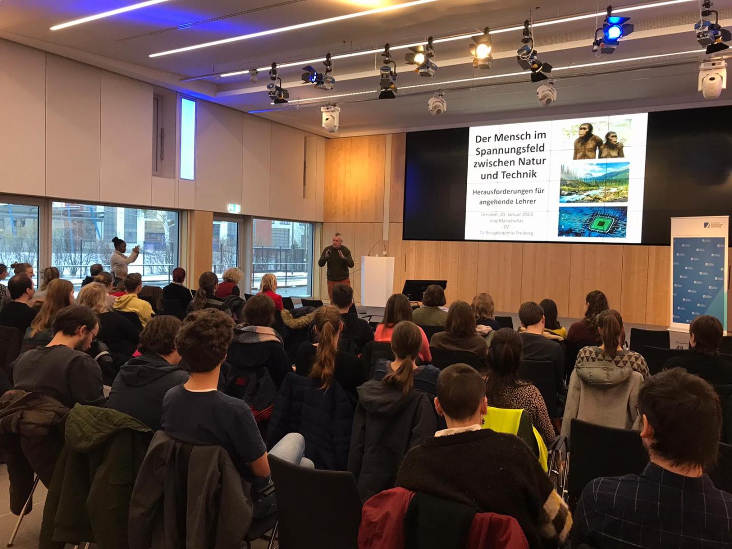 Am 20.01.2023 fand unsere diesjährige Referendarfortbildung statt. Ca. 60 angehende Lehrkräfte versammelten sich im Bildungszentrum der Handwerkskammer Dresden, um an Vorträgen, Workshops und Diskussionen teilzunehmen. Als Fokus der Veranstaltung wurde der Mensch im Spannungsfeld zwischen Natur und Technik betrachtet, da zukünftige Lehrerinnen und Lehrer im Unterricht nicht nur Wissen vermitteln werden, sondern auch eine Vorbildfunktion einnehmen und Einfluss auf die Meinungsbildung ihrer Schülerinnen und Schüler haben werden. Damit der Berufseinstieg also erfolgreich gelingen kann, sollten die Referendare während dieser Fortbildung die eigene Haltung und auch die Grenzen der Wissenschaft reflektieren.
