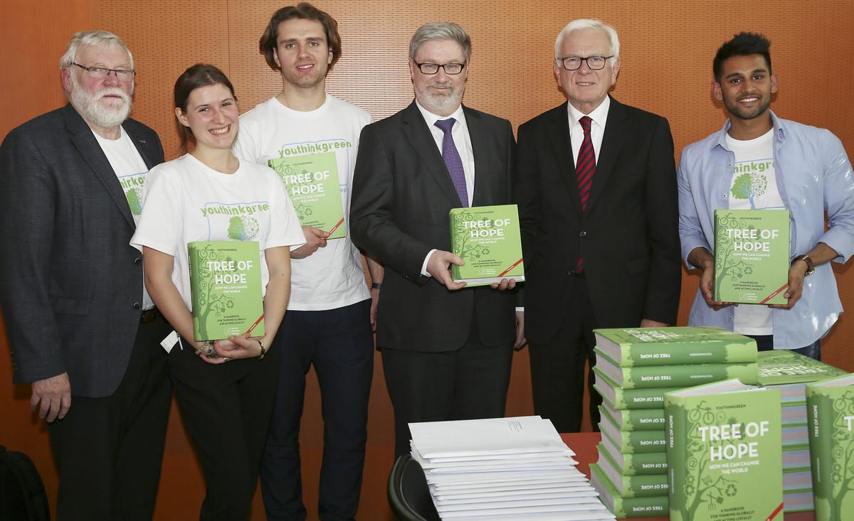 Diese Motivation und Tatkraft hat den Vorsitzenden der Konrad-Adenauer-Stiftung tief beeindruckt. Gemeinsam mit Bundeskanzlerin Angela Merkel und der ehemaligen Generalsekretärin des Sekretariats der Klimarahmenkonvention der Vereinten Nationen, Christiana Figueres, hat er das Projekt „Tree of Hope“ als Schirmherr unterstützt. "Initiativen wie diese können noch viel stärker wirken, wenn sie auch die Unterstützung durch die Politik erfahren." Mit diesen Worten übergaben Dr. Hans-Gert Pöttering und Helmut Spiering, Initiator und Vorsitzender von youthinkgreen –jugend denkt um.welt 20 Bücher der englischsprachigen Ausgabe von „Tree of Hope“ an Ministerialdirektor Röller, der seinerseits versprach, bei einem der Vorbereitungstreffen der G20-Berater auf das Gipfeltreffen Anfang Juli in Hamburg, die Bücher an seine Kollegen der G20 weiter zu reichen.
