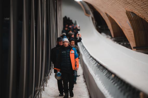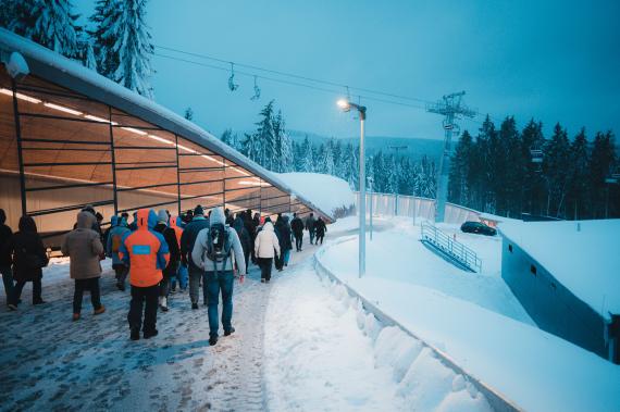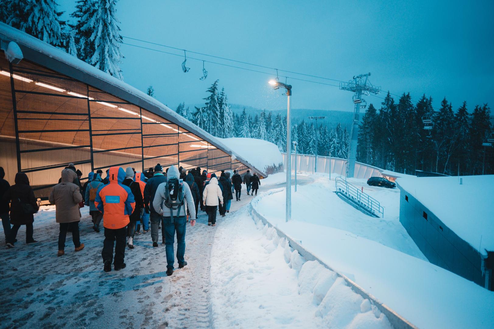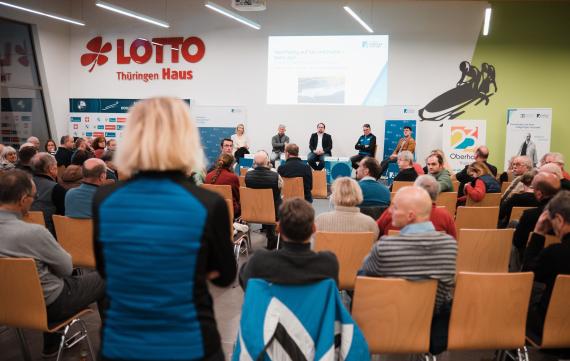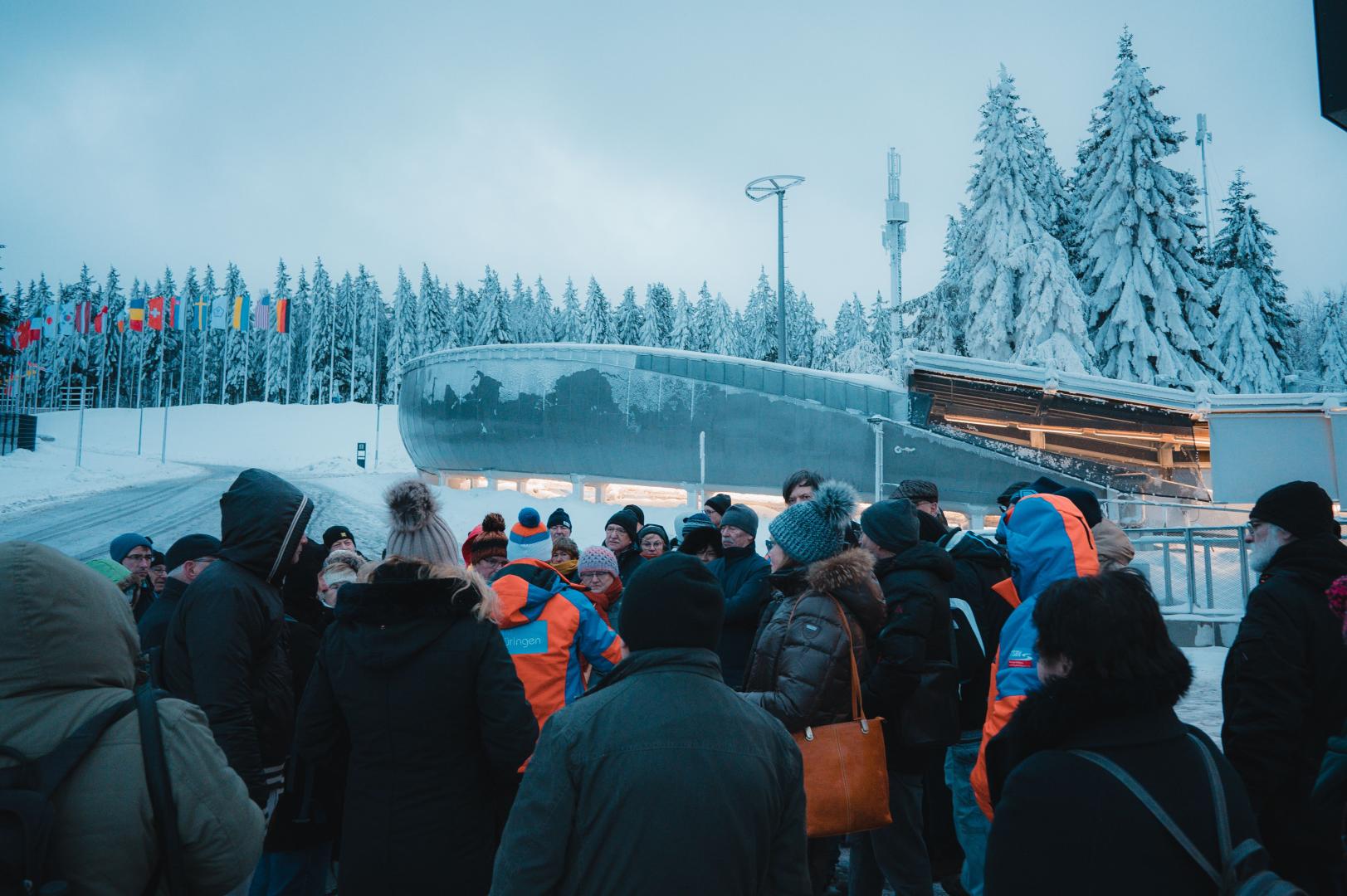 Der Wintersportstandort Oberhof hat im Thüringer Wald eine lange Tradition. Aufgrund des Klimawandels stellt sich die Frage, inwiefern der Wintersport in Thüringen eine Zukunft hat und wie diese nachhaltig gestaltet werden kann. Am 01. Februar 2023 sollte dieser Frage im Zuge einer Diskussionsrunde unter dem Titel „Nachhaltig auf Ski und Kufen unterwegs?“ in Oberhof nachgegangen werden. Viele Teilnehmer/-innen trafen bereits früher in Oberhof ein, um vorab an der Besichtigung und Führung der 1355 Meter langen Rennschlitten- und Bobbahn teilzunehmen, auf der vor wenigen Tagen die Weltmeisterschaft im Rennrodeln ausgetragen wurde – mit überragenden Erfolgen der deutschen Sportlerinnen und Sportler, die acht von neun Wettkämpfen gewannen.