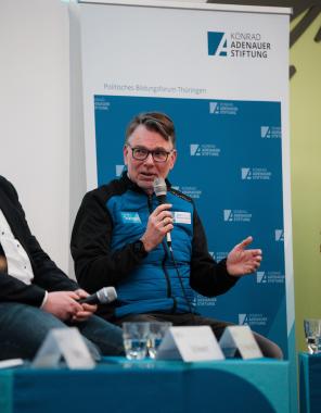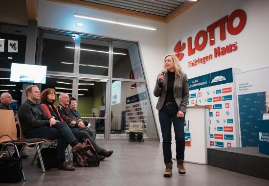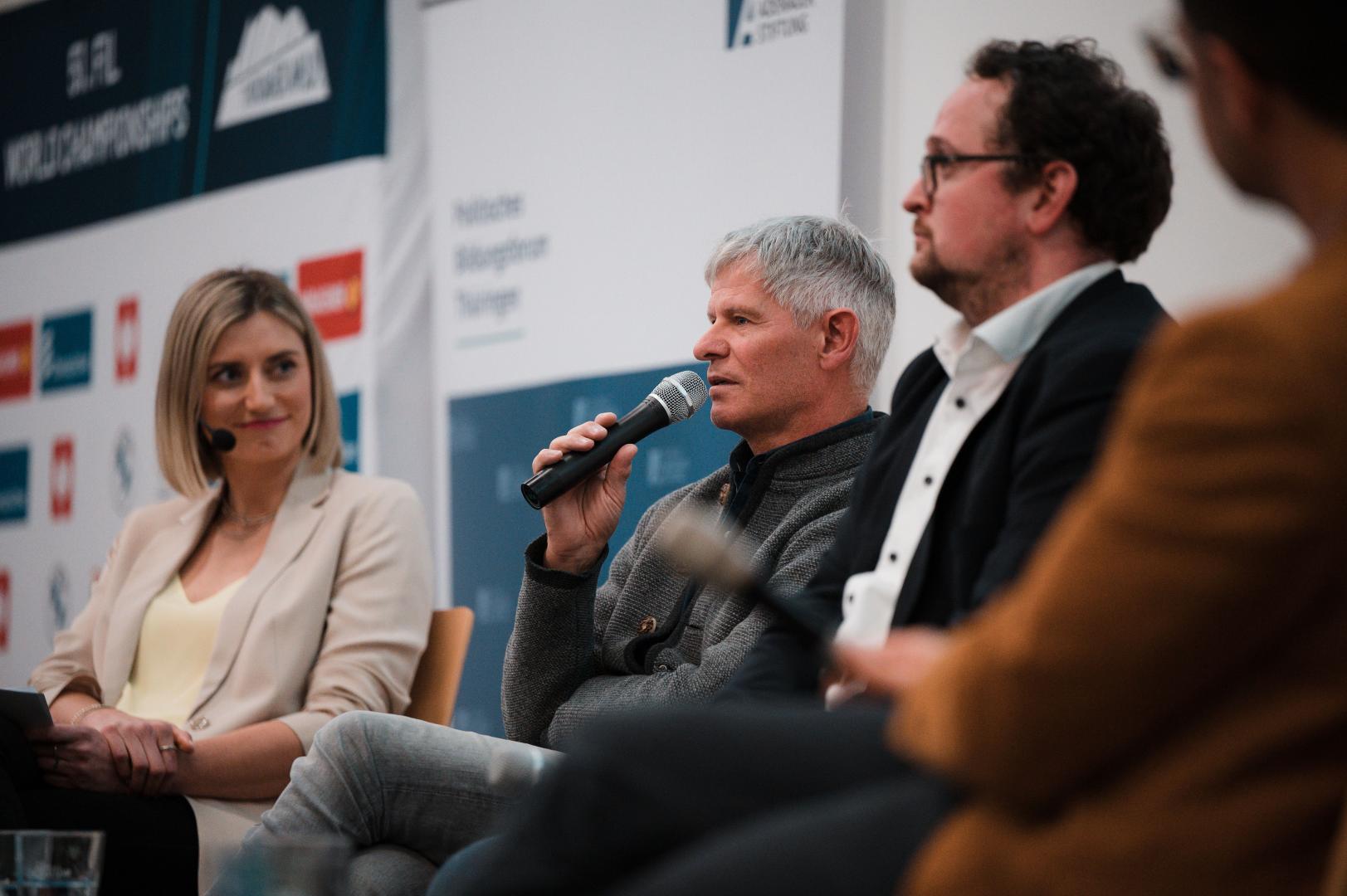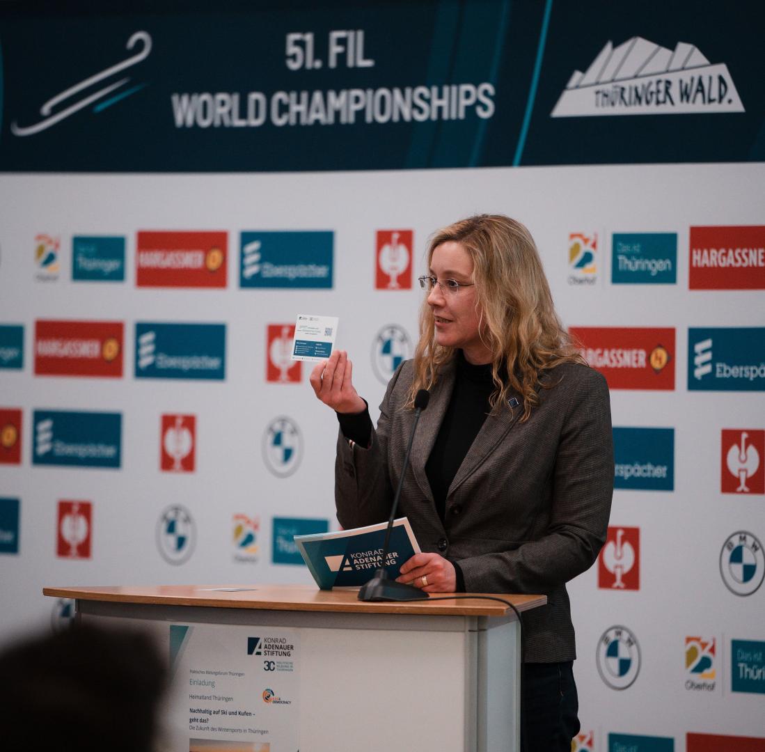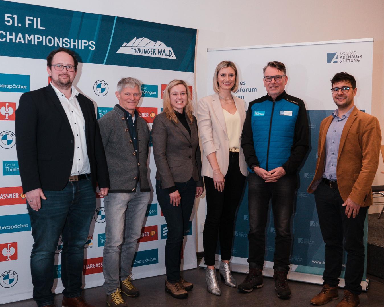 Eröffnet wurde die Veranstaltung durch die Landesbeauftragte und Leiterin des Politischen Bildungsforums der Konrad-Adenauer-Stiftung Thüringen Maja Eib, die weit über 80 Multiplikatoren aus ganz Thüringen und die Podiumsteilnehmer in einer winterlichen Atmosphäre, geprägt durch Kälte und Schneefall, begrüßen konnte. Die von Sportjournalistin Stefanie Benke moderierte Gesprächsrunde mit den Experten aus Wissenschaft, Sport, Politik und Verwaltung wurde vom Publikum mit Spannung verfolgt und mit vielen eigenen Fragen, Beiträgen und Ideen in der Diskussion bereichert. Als Podiumsgäste waren geladen: Dr. Hartmut Schubert, Staatssekretär im Thüringer Finanzministerium und WM- und Oberhofbeauftragter der Landesregierung, Dr. Maximilian Witting, Mitarbeiter von der Ludwig-Maximilians- Universität München und Experte für Klimawandel und Wintersport, Hubert Schwarz, Geschäftsführer des Deutschen Skiverbandes und Olympiasieger 1988 sowie Dr. Thadäus König MdL, sportpolitischer Sprecher der CDU-Fraktion im Thüringer Landtag.