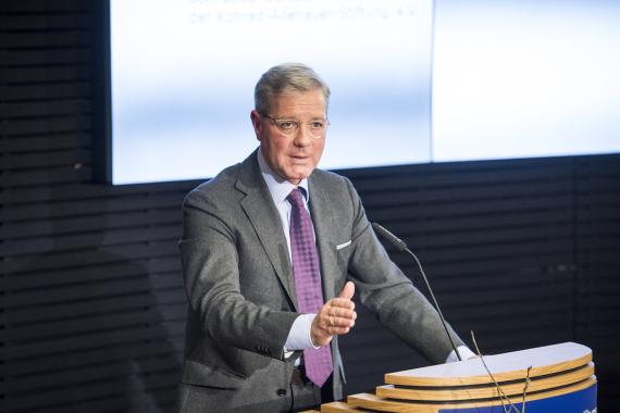 Zu viele Herausforderungen überkommen Europa wellenartig, auf die Antworten gefunden werden müssten, erläutert Röttgen. Globale Machtverschiebungen, wachsende Machtakteure im Westen wie Osten sowie die Entwicklungen in der Levante und im Mittleren Osten haben Auswirkungen auf Europa. Er stelle seine Idee von einer Allianz aus wenigen europäischen Staaten bestehend aus Deutschland, Frankreich, Spanien und Italien vor, die sich auf eine gemeinsame außenpolitische Linie verständigen und als Leuchttürme agieren. Dabei dürften die Interessen der kleineren Staaten insbesondere der osteuropäischen nicht außer Acht gelassen werden. „Eine Balance zwischen außenpolitischer Initiative und klarer Praxis mit osteuropäischen Staaten ist zwingend geboten“, sagt Röttgen. Nur so könne Europa zu einem handlungsfähigen Akteur, der auf Augenhöhe mit den USA und Russland agiere, werden.