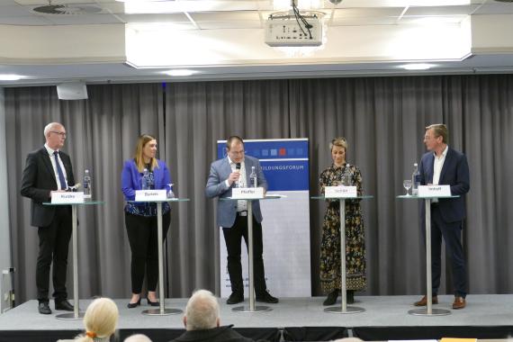 Beide diskutierten daraufhin mit den Wirtschaftsvertretern Kurzke und Bartels. Die Podiumsrunde wurde von Pfeiffer moderiert und am Ende für die Fragen des Publikums geöffnet. Es wurden die Themen der vorrausgehenden Vorträge aufgegriffen und genauer besprochen. Kurzke und Bartels setzten sich für eine wirtschaftsfreundlichere Politik ein und kritisierten die überbordende Bürokratie. Sie forderten einen besseren Austausch von Staat und Unternehmen und regten an, offenere Wechselmöglichkeiten zwischen Staats- und Wirtschaftsbeschäftigungen zu schaffen, um mehr gegenseitiges Verständnis und auch Innovationen zu fördern. Bartels argumentierte für eine flexiblere Arbeitszeitregelung, um sowohl mehr an Möglichkeiten für Projekte zu ermöglichen als auch eher auf die Bedürfnisse der Arbeitnehmer eingehen zu können. Ein großer Konsens konnte im Bereich der (Aus-)Bildung gefunden werden, den alle Teilnehmer als Schlüsselaspekt für alle weiteren Problemlösungen sahen und verbessern möchten.