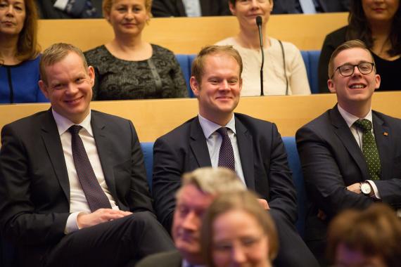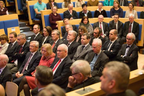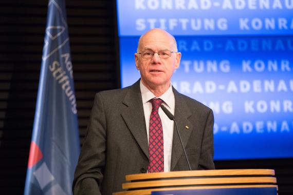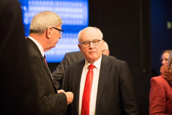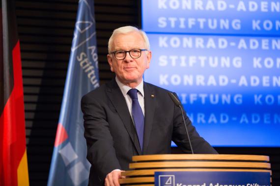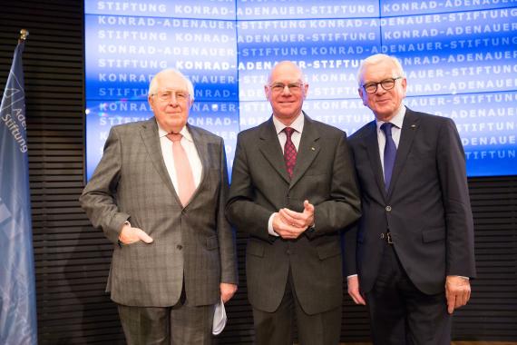 Lammert würdigte Pötterings Verdienste für die Stiftung und dessen unermüdlichen Einsatz für Europa. Der ehemalige Bundestagspräsident bedankte sich für die lobenden Worte, das Vertrauen in ihn. Er freue sich auf die neuen Aufgaben. Die Stiftung sei in einem guten Zustand, auch „schlagkräftig“. „Aber Stiftungen müssen in erster Linie Autorität haben und sie sich ständig neu erarbeiten“, sagte er. Er beobachte, dass die Adenauer-Stiftung im Ausland einen besseren Ruf als im Inland habe. Lammert regte dazu an, darüber selbstkritisch nachzudenken. Er räumte ein, dass nicht alle Erwartungen mit diesem Amtswechsel erfüllt werden könnten. „Die Hoffnung, dass eine Stiftung, die den Namen Konrad Adenauers trägt, die die Politik seiner Partei konzeptionell weiterentwickeln, neu formulieren, oder umgekehrt auf ihren vermeintlich verloren gegangenen Kern zurückführen solle, ist deshalb voll daneben, weil politische Stiftungen weder der verlängerte Arm noch der ausgelagerte Kopf ihrer befreundeten Parteien sind.“ Die Stiftung müsse sich an Konrad Adenauers Grundsatz, ein einiges und handlungsfähiges Europa zu schaffen, orientieren, das auch im Interesse des Gemeinwohls sei.