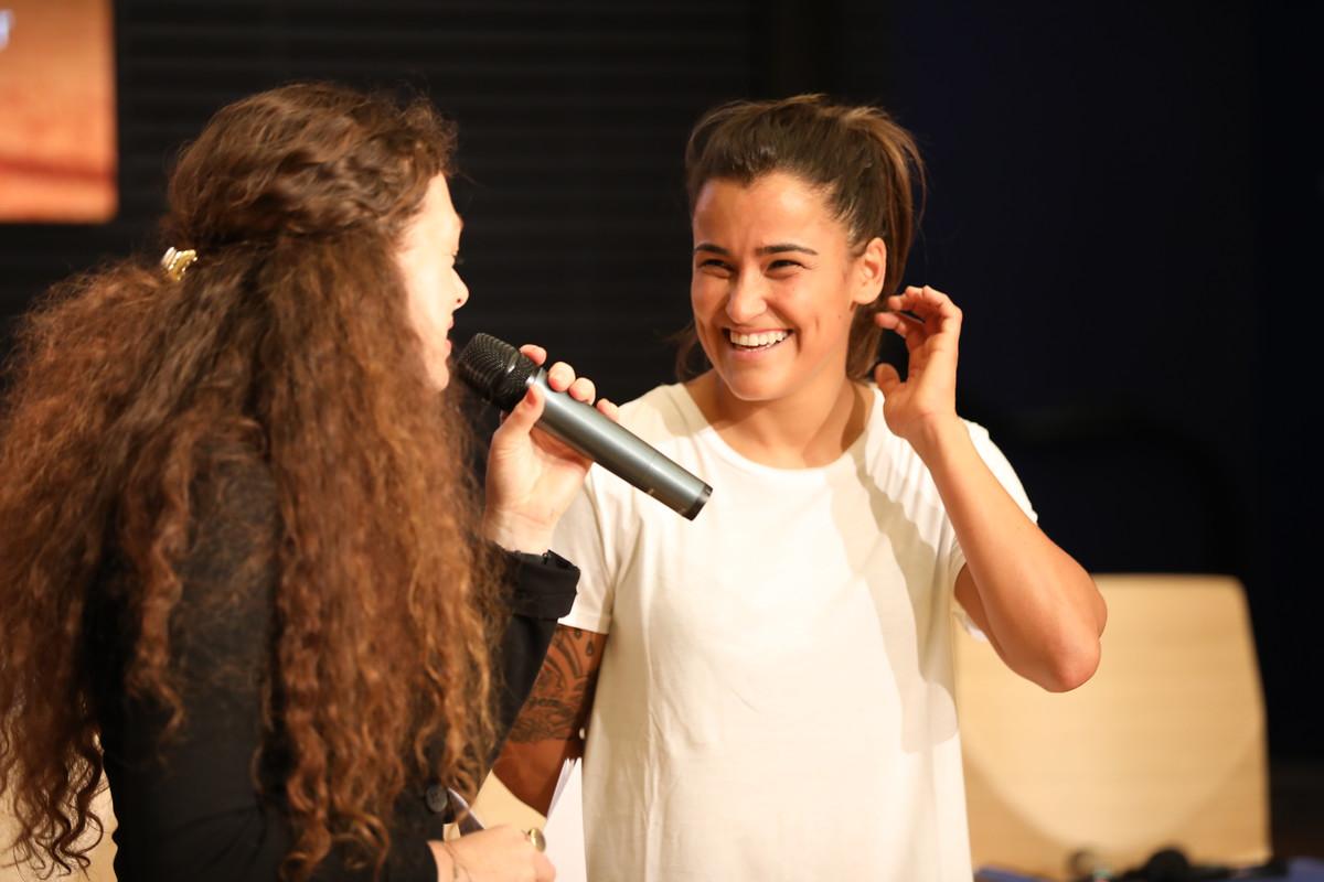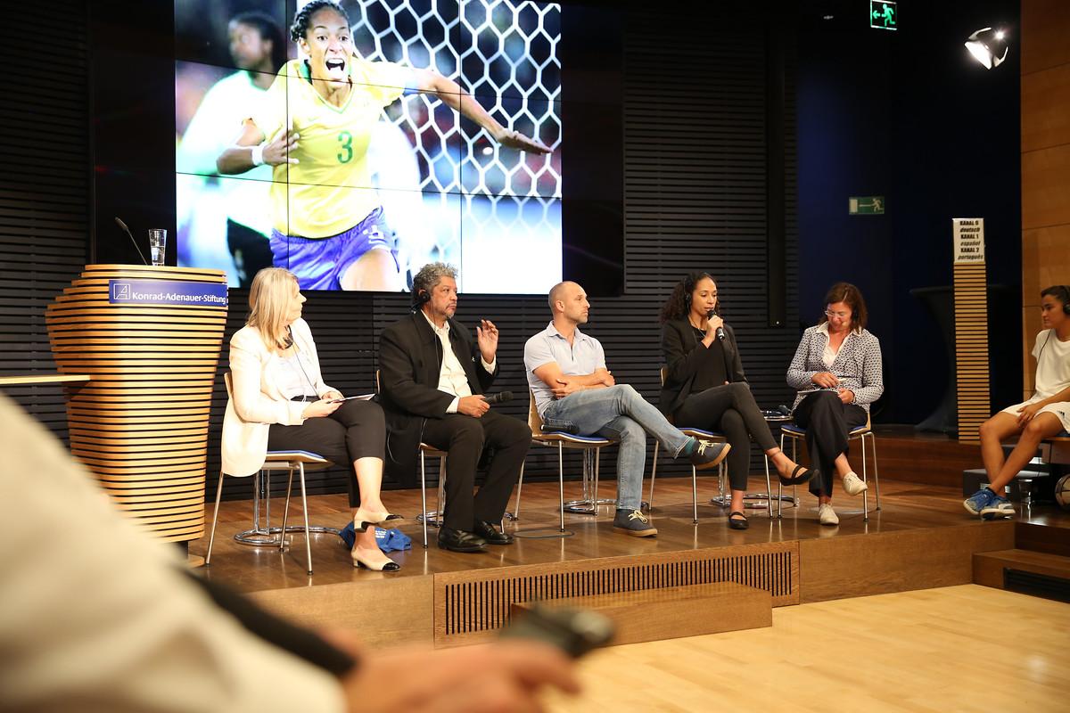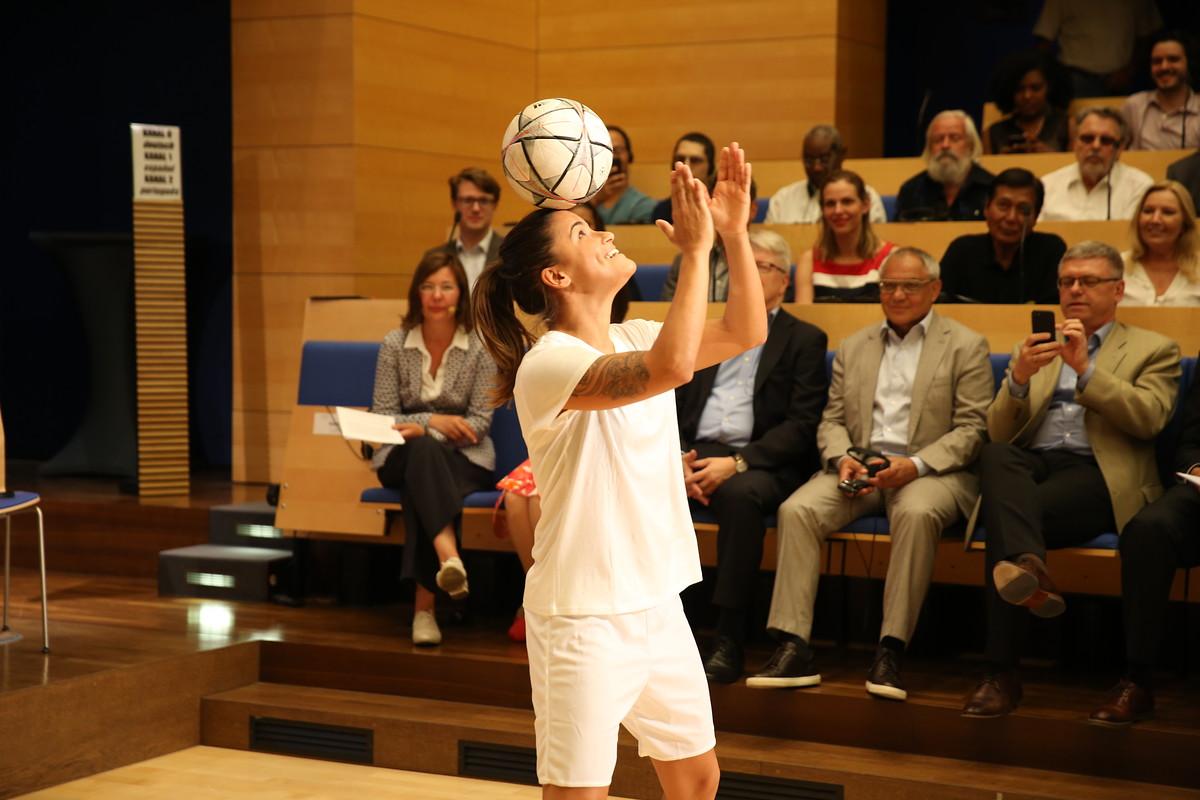 „Brasilien ist ein Fußballland“, sagt Aline Pellegrino. Jedoch nur ein Fußballland für Männer, schränkt sie ein. Die ehemalige Spielführerin der brasilianischen Frauennationalmannschaft begann ihre Fußballkarriere ähnlich wie Freestylerin Aylin Yaren auf der Straße. Als Aline 1982 in São Paulo geboren wurde, ist es Frauen erst seit drei Jahren überhaupt erlaubt, Fußball zu spielen. Bis 1979 war Fußball für Frauen in Brasilien gesetzlich verboten. In der Diskussion mit Moderatorin Romy Köhler erzählt Aline Pellegrino von einer Zerrissenheit, die sie in ihrem Land mehr und mehr spürt. Der Sport habe die verbindende Kraft, die Menschen wieder zusammenzubringen. Damit das gelingt, müssen auch die Athleten Position gegen Geschlechterklischees und Vorurteile auf dem Spielfeld und auch in der Gesellschaft.