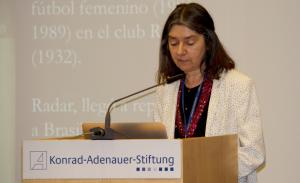 Cornelia Schmidt-Liermann, Mitglied der argentinischen Abgeordnetenkammer und Vorsitzende des Auswärtigen Ausschusses, erzählt in der Diskussionsrunde von ihrem Kampf gegen Korruption, nicht nur in der argentinischen Politik, sondern auch im Fußball. Wieso ist Fußball in Lateinamerika so emotional? Weil Fußball hier „Teil des Vaterlandes“ ist“, so die Politikerin.
