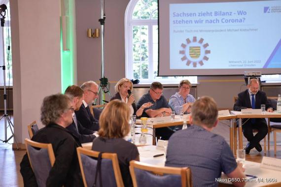 Um diesen dringend benötigten Austausch zu ermöglichen und sich der sächsischen Corona-Politik aus unterschiedlichen Perspektiven anzunähern, fand am Mittwoch, den 22. Juni 2022 eine Gesprächsrunde mit Ministerpräsident Michael Kretschmer statt, zu welcher Vertreter und Vertreterinnen zahlreicher gesellschaftlicher Gruppen und Regionen Sachsens eingeladen waren. Am "Runden Tisch" des Politischen Bildungsforums Sachsen hatten die Teilnehmenden die Möglichkeit, von Ihren persönlichen Einschätzungen und Erfahrungen zu berichten. Nach einer Begrüßung durch Dr. Joachim Klose hatten alle anwesenden Bürger und Bürgerinnen zunächst die Gelegenheit für ein individuelles Statement, in welchem sie ihre Wahrnehmungen, Lob und auch Kritik zum Ausdruck brachten.