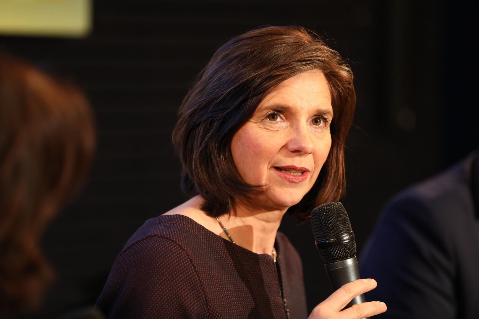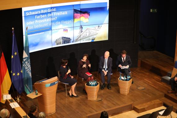 Katrin Göring-Eckardt betonte, wie wichtig die Diskussionskultur für die Demokratie sei. Gerade in der Politik, wo viele Meinungen aufeinandertreffen, sei eine konstruktive Diskussion unabdingbar, um Lösungen zu finden. „Für Demokratie muss ich mich einsetzen“, sagte die Vorsitzende der Fraktion Bündnis 90/Die Grünen im Deutschen Bundestag und zeigte sich erfreut darüber, dass sich viele Jugendliche aktiv beteiligen. „Die Fahne ist für mich ein Symbol der Identität, doch sie ist nicht eindimensional“, sagte Göring-Eckardt. Die Farben vereinen nicht nur ihre thüringische, deutsche und europäische Identität, sondern auch Freiheit, Werte und Demokratie. Sie lehnte es jedoch ab, nationale Feierlichkeiten den Bürgern aufzudrängen oder Fahnen als Zeichen des Nationalbewusstseins zu schwenken, da sie als ehemalige DDR-Bürgerin damit negative Erfahrungen verbinde. „Ich möchte, dass sich jeder in Deutschland mit schwarz, rot, Gold identifizieren kann“, sagte die Bündnis90/Die Grünen-Fraktionsvorsitzende und betonte wie wichtig der Zusammenhalt in Deutschland sei.