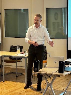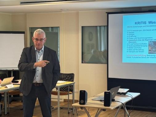 Abschließend lenkte Aldo Kleemann, Oberstleutnant im Generalstab und Gastwissenschaftler bei der Stiftung Wissenschaft und Politik, den Blick auf hybride Bedrohungen und digitale Desinformation. Besonders eindrucksvoll war der Einsatz multimedialer Elemente, durch die die Teilnehmenden die Wirkweise von Fake News und Deep Fakes nachvollziehen konnten. Kleemann verwies auf die strategische Nutzung von Künstlicher Intelligenz durch ausländische Akteure – insbesondere durch Russland –, mit dem Ziel, gesellschaftliche Spaltung herbeizuführen. Darüber hinaus beleuchtete er die Rolle des Militärs innerhalb eines gesamtstaatlichen Resilienzkonzepts. Ausgehend von verfassungsrechtlichen Grundlagen legte er dar, wie der Einsatz der Bundeswehr im Inneren und Äußeren rechtlich begrenzt sei. Besondere Aufmerksamkeit widmete er dem unter Geheimhaltung stehenden OPLAN DEU, einem Operationsplan zum Schutz verteidigungsrelevanter Infrastrukturen, der zivile und militärische Fähigkeiten integriere.