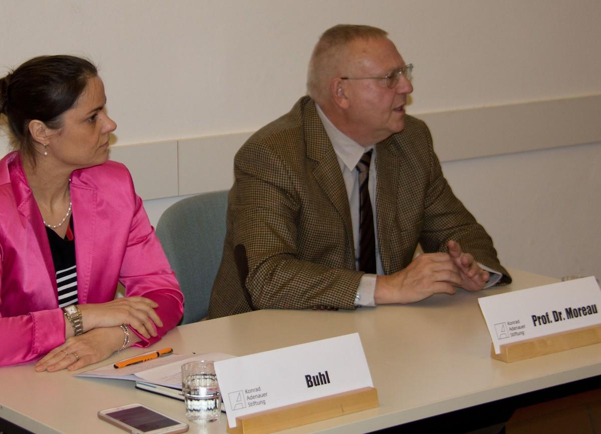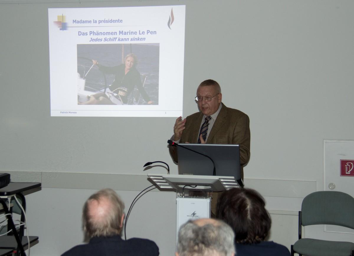 Und wie stehen die Chancen, dass Marine Le Pen in wenigen Wochen „Madame Le Président“ wird? Momentan gibt es ein Kopf-an-Kopf-Rennen zwischen Le Pen und Emmanuel Macron, Kandidat der Partei „En Marche!“. Gerade letzterer gelte als „frisches Gesicht“, so Moreau, und ziehe viele Wähler an, die sich neuen Wind in der politischen Klasse Frankreichs wünschten. Mit jeweils 26 Prozent lägen beide momentan vorn – und im zweiten Wahlgang geht Moreau von einem Sieg Macrons aus. Das Le Pen allerdings doch gewinnen sollte, hält er für „unwahrscheinlich aber nicht unmöglich“. Der Extremismusforscher versuchte die Zuhörer in Steglitz-Zehlendorf zu beruhigen: Le Pen habe keine Möglichkeit die Europäische Union allein zu verlassen oder eine Verfassungsänderung durchzusetzen, „die Deutschen können in Ruhe schlafen.“