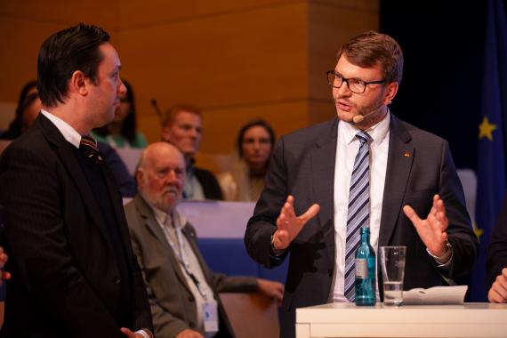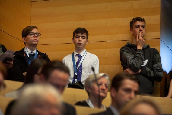 Auch rund 70 Schüler aus vier Berliner Gymnasien (Jüdisches Gymnasium Moses Mendelssohn, Willi-Graf-Gymnasium, Theresienschule, Herdergymnasium) waren zu Gast. Unter dem Titel „Today for future. Wenn wir könnten, wie wir wollten“ diskutierten sie in einem Workshop über die Herausforderungen der zunehmenden Digitalisierung. Anschließend stellte sich Paul Ziemiak, CDU-Generalsekretär, ihren kritischen Fragen. Dabei ging es um Umweltpolitik und die Klimaziele der Bundesregierung. Eindringlich appellierte Ziemiak daran, nicht nur zu demonstrieren, sondern auch politisch aktiv zu werden und sich in Parteien zu engagieren. Denn dies sei der effektivste Weg, eigene Interessen durchzusetzen.