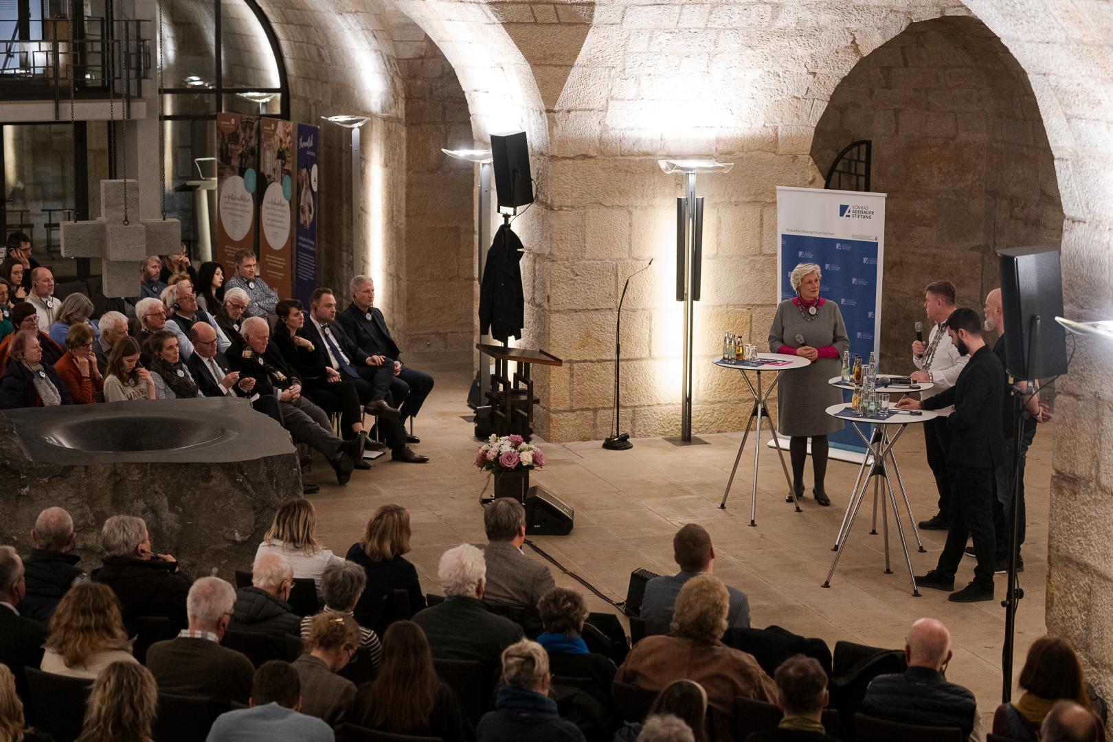 Nach den einleitenden Worten von Maria Noth (Geschäftsführerin der Stiftung Frauenkirche Dresden), Ronny Heine (Konrad-Adenauer-Stiftung e.V.), dem sächsischen Landtagspräsidenten Alexander Dierks und dem Europaabgeordneten Oliver Schenk – die den Rahmen der Veranstaltung als mahnende Erinnerung setzten, sich nicht an den Krieg in der Ukraine zu gewöhnen und die Schicksale jener, die täglich ihr Leben für die Freiheit riskieren, nicht aus dem Blick zu verlieren – führte Alexandra Gerlach als Moderatorin durch das bewegende Gespräch mit den drei Soldaten.