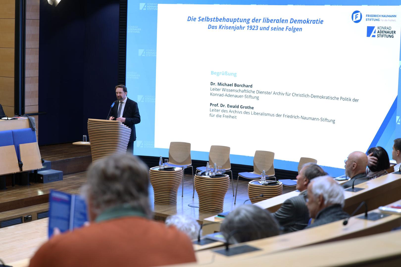 Dr. Michael Borchard, Leiter Wissenschaftliche Dienste/Archiv für Christlich-Demokratische Politik, führte in die Tagung ein. Dass die Weimarer Republik 1923 nicht scheiterte, sei dem entschlossenen Handeln der Männer zu verdanken, die die Demokratie mit allen Mitteln verteidigten, so Borchard.