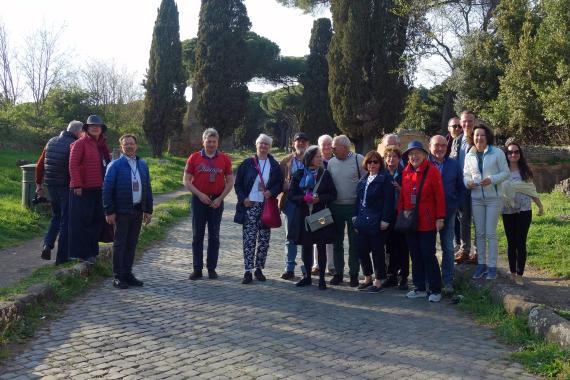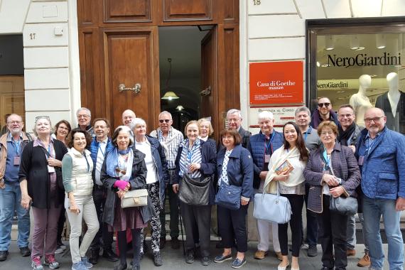 Da an diesem Tag der Stadtmarathon stattfand, musste das Programm umgestellt werden, denn mit dem Bus wäre kein Durchkommen gewesen. So wurde Rom zu Fuß erkundet. Ziele waren das Garibaldi-Denkmal auf dem Gianicolo, die Spanische Akademie mit dem Tempel von Bramante, die Kirche Santa Maria in Trastevere und die Tiberinsel. Wer Lust hatte, spazierte noch zum Kapitol und vorbei am Forum Romanum zum Colosseum. Am Montag erläuterte Caroline Kanter, Leiterin des Auslandsbüros Italien der Konrad-Adenauer-Stiftung in Rom, die Aufgaben vor Ort und die derzeitige Lage Italiens. Es folgte eine Führung durch die Casa di Goethe. Dr. Maria Gazzetti, Leiterin des Hauses, hatte die Tore an diesem Tag nur für den Freundeskreis geöffnet. Nach einer Mittagspause an der Piazza del Popolo brachte der Bus die Reisegruppe nach einem kurzen Stopp bei den Caracalla-Thermen zur imposanten Basilika San Paolo Fuori le Mura und von dort zur Kirche „Domine Quo Vadis?“. Zum Tagesabschluss spazierte die Gruppe vor den Toren auf der Via Appia Antica – ein besonderes Erlebnis für alle. Ziele des letzten Tages in Rom waren die Kirche S. Carlo alle Quattro Fontane, die Kirche S. Andrea al Quirinale, der Trevi-Brunnen, die Spanischen Treppe, der Pincio mit seinem wunderbaren Blick auf die Stadt und die Priscilla-Katakomben.