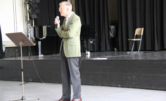 Der Kuratoriumsvorsitzende der Stiftung 20. Juli 1944, selbst Sohn eines Widerstandskämpfers, schilderte den aufmerksamen Jugendlichen anhand der eigenen Familiengeschichte sehr authentisch die Zeit des Nationalsozialismus sowie der Nachkriegszeit. Die Mitwirkung seines Vaters am Attentat auf Hitler führte dazu, dass dieser kurz nach dem 20. Juli 1944 in Plötzensee hingerichtet wurde. Der Referent ging in seinem eindrucksvollen Vortrag aber auch auf andere Widerständler, wie Willi Graf, den Namensgeber der Schule, Hans und Sophie Scholl, Georg Elser, den militärischen Widerstand um Claus Graf Schenk von Stauffenberg und den Kreisauer Kreis ein. Unter Einbindung der Schülerinnen und Schüler arbeitete er sehr anschaulich die Unterschiede zwischen Diktatur und Demokratie heraus und unterstrich wie glücklich sie sich schätzen könnten in einem freiheitlich-demokratischen Rechtsstaat leben zu können. Nachdem er ihnen demonstriert hatte, wie man sich in einer Diktatur für Freiheit und Gerechtigkeit - allerdings unter Einsatz seines Lebens – einsetzen kann, zeigte er ihnen auf, wie sie sich heute risikofrei engagieren können. Dr. Axel Smend mahnte die jungen Erwachsenen, wachsam zu sein, aufzupassen, sich zu informieren, sich ein eigens Urteil zu bilden und selbst Verantwortung zu übernehmen. Ohne dieses Engagement, so der Referent, drohe ansonsten die Gefährdung des Fortbestands unserer Demokratie und unseres Rechtsstaats.