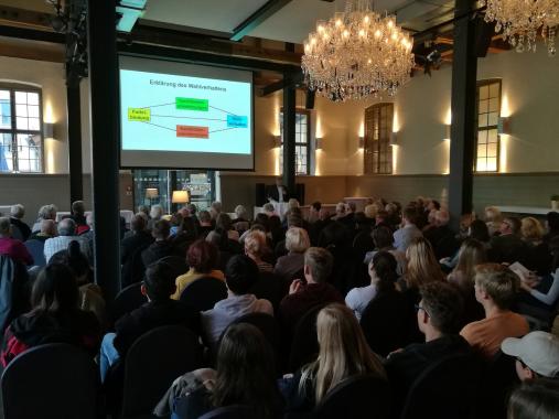 Anhand der Kriterien Wählerbindung, Kandidaten und Sachthemen ging Niedermayer auf die Motive der Wähler ein. Beim Bindungsfaktor habe die Union bis zuletzt einen deutlichen Vorsprung vor der Sozialdemokratie gehabt. Angela Merkel habe als Spitzenkandidatin, obwohl sie schlechter als vor der Flüchtlingskrise abschnitt, dennoch viel mehr gezogen als Martin Schulz, der nur nach seiner Nominierung in den Umfragen ein Strohfeuer entfacht habe, dass dann schnell verglühte. Nach dem Fernsehduell der Spitzenkandidaten Merkel und Schulz galt die Wahl in der veröffentlichten Meinung schon als entschieden für die Union. Die Diskussion habe sich von da ab vor allem auf den dritten Platz konzentriert, auf das Abschneiden von FDP und AfD. Bei den Sachthemen hätte nach wie vor die Flüchtlingspolitik mit 44 Prozent die größte Bedeutung gehabt, weit vor den Themen Rente (24 %), Soziale Gerechtigkeit (16 %), Bildung (13 %), Krisen (9 %) und Arbeit (8 %). Mit dem erneuten Aufkommen der Diskussion über die Flüchtlingspolitik im Sommer, die die Parteien der Regierungskoalition vermeiden wollten, habe die AfD deutlich zulegen können. Die FDP sei gerade auch von ehemaligen CDU-Wählern sozusagen als "rechtstaatliche" Alternative zur AfD gewählt worden, was einen Teil ihres guten Ergebnisses ausmache.
