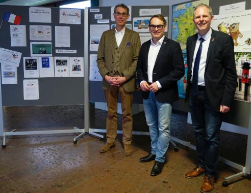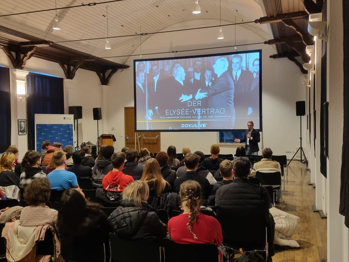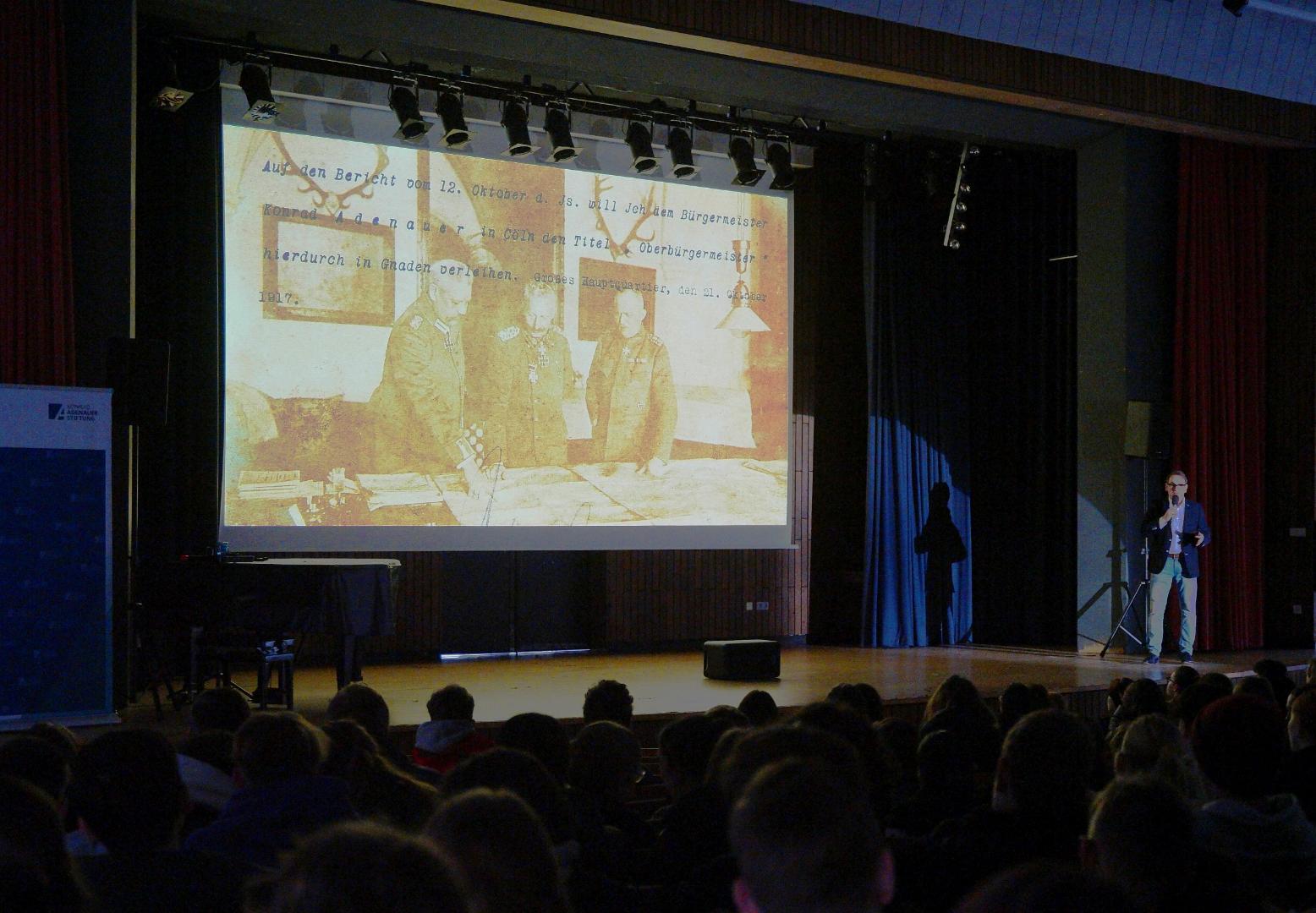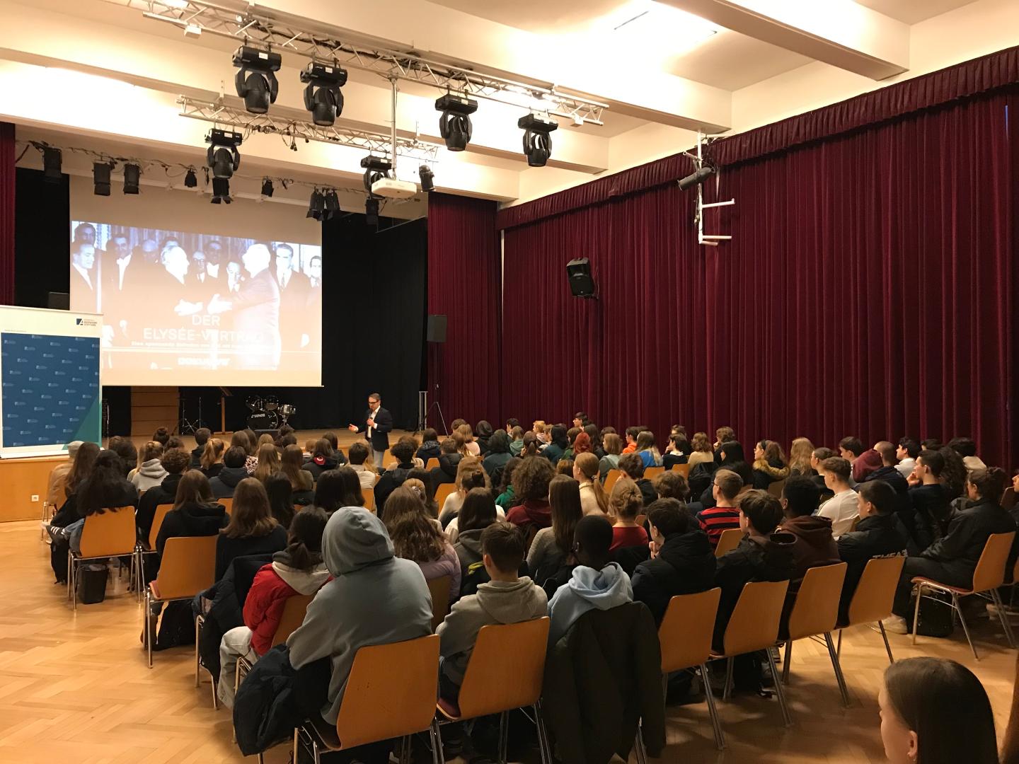 Mit seiner Multimedia-Präsentation zu den deutsch-französischen Beziehungen nahm der Politikwissenschaftler Ingo Espenschied knapp 500 Schülerinnen und Schüler mit auf eine Zeitreise in die wechselvolle Geschichte beider Staaten. Dem deutschen Bundeskanzler und dem französischen Staatspräsidenten sei eine Art politisches Wunder gelungen: Ein politisches "Reset", um der in Jahrhunderten angeheizten Spirale der gegenseitigen Feindschaft ein Ende zu machen. Konrad Adenauer und Charles de Gaulle besaßen zwischen 1958 und 1963 den Mut, persönliche Zweifel und politiche Blockaden in den eigenen Reihen zu überwinden und fanden in der deutschen Öffentlichkeit eine eindruckvolle Bestätigung für die Richtigkeit ihrer politischen Entscheidungen.
