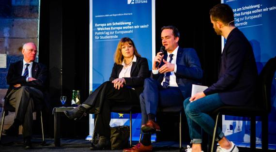 Die Chance zum Austausch in der anschließenden Podiumsdiskussion nutzten auch die beiden Vertreter aus Belgien und Frankreich zusammen mit Lammert. Oliver Paasch, Ministerpräsident der Deutschsprachigen Gemeinschaft Belgiens, pflichtete dem Aachener Oberbürgermeister bei, dass die Grenzregion ein Gewinn für alle sei. „Belgien wäre ohne EU nicht lebensfähig“, sagte er. Für ihn bedeute Europa mehr Lebensqualität, Arbeitsplätze und auch grenzüberschreitende Lebensrettung im medizinischen Bereich. Für ein gelingendes Europa brauche es eine Vision, erklärte Dr. Olivia Berkeley-Christmann. Die Generalkonsulin der Französischen Republik befürwortete den impulsgebenden, aber auch kämpferischen Ansatz ihres Staatspräsidenten Emmanuel Macron. Sie forderte, dass die deutsch-französische Freundschaft weiterentwickelt werden müsse, zum Beispiel durch Schüleraustausche, Städtepartnerschaften oder grenzüberschreitende Mobilität von Studierenden und Auszubildenden.