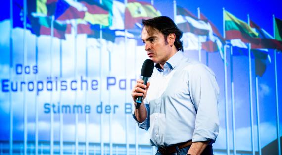 Wie sehr dafür demokratische Strukturen erforderlich sind, verdeutlichte danach der Historiker und Journalist Ingo Espenschied in einem multimedialen Vortrag über die Entstehung und Funktion des Europäischen Parlaments. „Wir brauchen ein demokratisches Europaparlament, wenn wir ein starkes Europa haben wollen“, sagte er und bezeichnete es als „politischen Selbstmord, wenn wir uns abschotten“. Daher appellierte er an die jungen Europäer im Saal, ihre Stimme bei der Europawahl abzugeben.