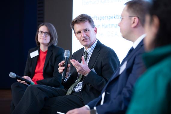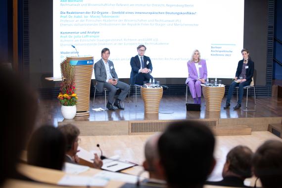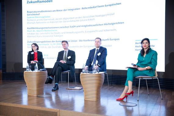 Das letzte Panel wagte schließlich den Blick in die Zukunft. Gegenstand der von Dr. Roya Sangi M.A. (Rechtsanwältin bei Redeker, Sellner, Dahs Berlin) moderierten Podiumsdiskussion waren Reformbestrebungen auf gerichtlicher sowie gesamteuropäischer Ebene. Ioanna Dervisopoulos, Richterin am Hessischen Staatsgerichtshof und ehemals Referentin im Kabinett der Generalanwältin Juliane Kokott, ging auf bereits erfolgte sowie noch denkbare Reformen am „Motor der Integration“ ein, die zur Entlastung des Gerichtshofs beitragen sollen. Der Fokus ihrer Ausführungen für eine Reform de lege ferenda lag auf der in Art. 256 III AEUV angelegten Möglichkeit, Vorabentscheidungsersuchen an das Gericht abzugeben, was sie im Ergebnis jedoch skeptisch sah. Der Inhaber des Lehrstuhls für Staats- und Verwaltungsrecht, Europa- und Völkerrecht an der Universität Tübungen, Prof. Dr. Martin Nettesheim, beschäftigte sich mit Konfliktlösungsmechanismen zwischen EuGH und den mitgliedstaatlichen Verfassungsgerichten, wobei er zunächst zwischen drei verschiedenen Konflikttypen unterschied (Auslegungskonflikte, Aufgabenkonflikte, Grundstruktur-/Wertekonflikte). Nettesheim sprach sich im Ergebnis gegen die Einrichtung weiterer Gremien für letztere beide Konflikte aus, vielmehr sollten diese auf politischer Ebene gelöst werden. Benjamin Hartmann, Referent bei der Denkfabrik der Präsidentin der Europäischen Kommission I.D.E.A., gewährte als Stimme der Brüsseler Praxis letztlich einen Einblick in die Ergebnisse der Konferenz zur Zukunft Europas, die am 9. Mai 2022 ihren Abschluss fand. Die Konferenz habe zur Reflexion über unsere europäische Demokratie beigetragen und unterstrichen, dass die europäischen Institutionen einen engeren Dialog mit den Bürgerinnen und Bürgern führen sollten, so Hartmann. Bürgerforen wie bei dieser Konferenz würden fortan zu einem Bestandteil der europäischen Demokratie.