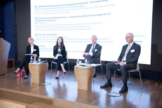 Das zweite, von Dr. Wolfgang Janisch moderierte Panel beschäftigte sich mit den Konflikten zwischen EuGH und den nationalen Verfassungsgerichten. Die Richterin am Europäischen Gericht und frühere Professorin an der Polnischen Akademie der Wissenschaften Prof. Dr. Krystyna Kowalik-Banczyk referierte über die Rolle des EuGH beim Schutz der europäischen Werte. Der Inhalt von Art. 2 EUV scheine mittlerweile vom EuGH von seinem bisherigen Status als rein stützende Programmatikvorschrift befreit und zu rechtlich verbindlichen Verpflichtungen für die Mitgliedstaaten geworden zu sein. Sie hob zudem das Prinzip der begrenzten Einzelermächtigung hervor, welches vom EuGH anders ausgelegt würde als von einzelnen nationalen Gerichten. Daran anknüpfend ging Narin Nosrati, Wissenschaftliche Mitarbeiterin und Doktorandin am Lehrstuhl für Völkerrecht und Öffentliches Recht an der LMU München, auf die „Widerstände“ von mitgliedstaatlichen Verfassungsgerichten ein, wobei sie die politische Dimension des jüngsten polnischen Urteils als Sonderfall betonte. Nosrati wies insbesondere auf die Rechtssachen „Meloni“ und „Taricco“ als Beispiele für den erfolgreichen Gerichtsdialog hin, der sich in der Vergangenheit als einzig sinnvolles Mittel zur Konfliktbeilegung, Deeskalation und Stärkung der Rechtsordnung gezeigt habe. Prof. Dr. Christian Calliess, Inhaber des Lehrstuhls für Öffentliches Recht und Europarecht an der FU Berlin, unterstrich letztlich in seinem Kommentar nochmals das Dasein der EU als Werteverbund mit den Verfassungsprinzipien des Art. 2 EUV als Fundament sowie die Wichtigkeit des Gerichtsdialogs. Im Wege der wertenden Verfassungsvergleichung müsse der EuGH „behutsam“ im Sinne der gegenseitigen Loyalität und Rücksichtnahme Kerngehalte des Art. 2 EUV ableiten, was zwar ein langer, auch sicher schmerzhafter, aber per se dialogischer Prozess zwischen den Gerichten sei.