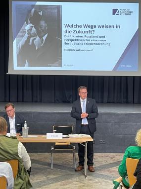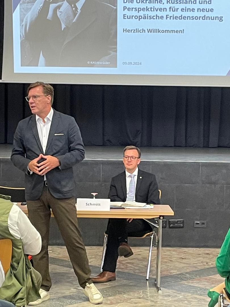 Nico Lange machte eindrücklich deutlich, dass zuerst die Ukraine militärisch so ausgestattet werden müsse, dass Russland tatsächlich ernsthaft auf dem Schlachtfeld unter Druck gerate, damit überhaupt eine Gesprächsbereitschaft erzwungen werden könne. Parallel müsse sich Europa endlich ehrlich die Frage stellen und beantworten, was für eine Sicherheitsordnung es eigentlich wolle. Aus seiner Sicht müssten für die Erhaltung des Status Quo vier Wege beschritten werden: Erstens eine Ausstattung der Ukraine, wegen der sich Russland keinen Angriff mehr trauen würde (Beispiel wehrhaftes Israel). Zweitens die Erlaubnis, ihre Waffen nach dem Völkerrecht einsetzen, also auch militärische Ziele im Lande des Aggressors angreifen zu dürfen. Drittens der Beitritt der Ukraine zur EU und zur NATO, da die Sicherheitskomponente der EU allein zu schwach sei. Und viertens müsse alles dafür getan werden, dass die USA ihre unverzichtbare Rolle für die Sicherheit Europas weiter aufrechterhielten, und dafür müssten wir selbst entschieden mehr investieren. Über diese Maßnahmen sei schließlich Frieden durch Abschreckung herzustellen – Sicherheit sei wichtiger als andere, und dem müsse alles untergeordnet werden.
