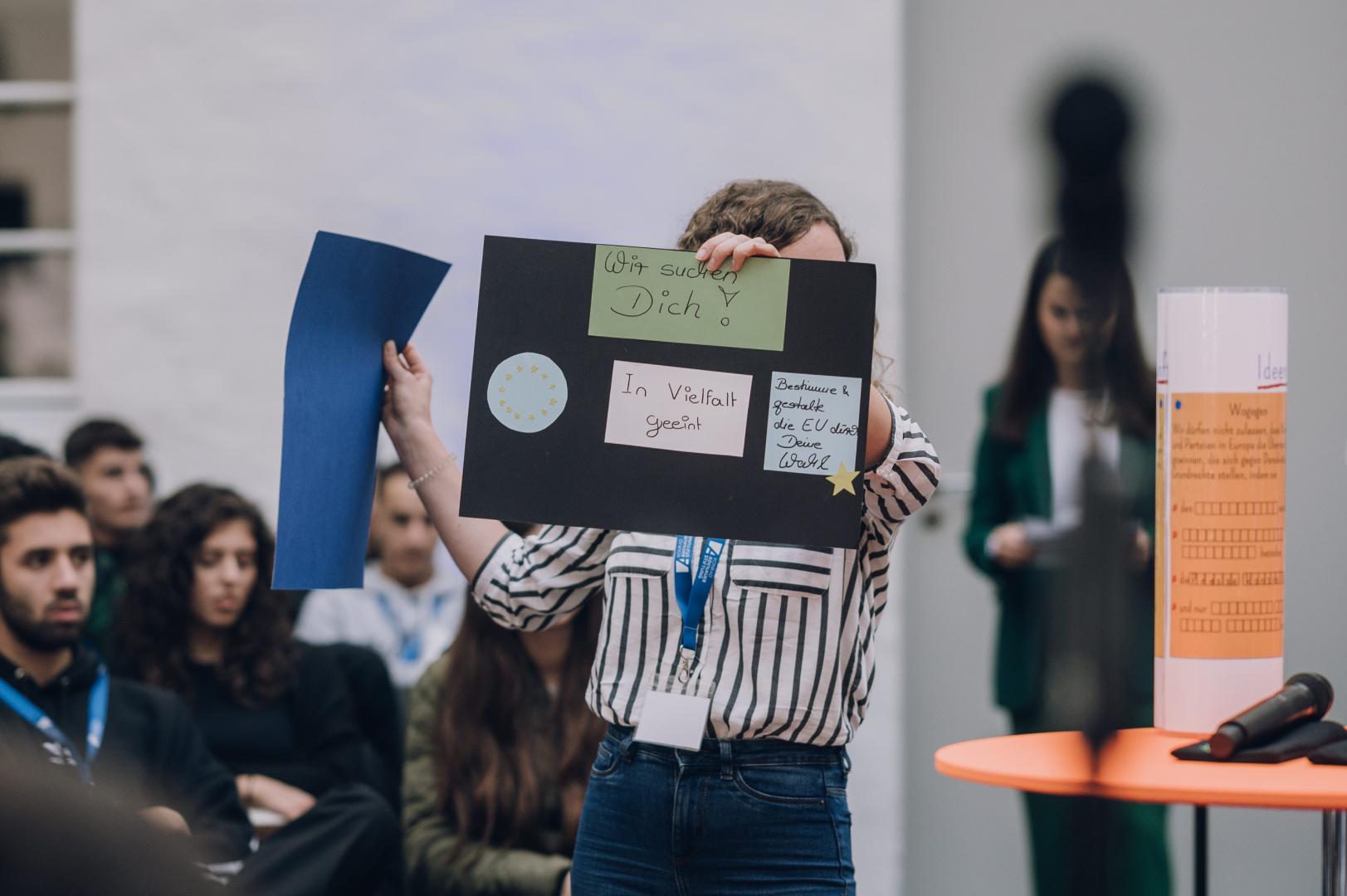 Im Workshop „Hinschauen & Gesicht zeigen: Was hat Zivilcourage und Engagement mit DIR und der Zukunft Europas zu tun?“ von Patrizia Cippa und Tim Noetzel sollten die Schüler*innen zunächst überlegen, was ihnen in Europa wichtig sei. Dabei fielen Begriffe wie „Freiheit“, „Frieden“ und „problemlos reisen“. Im nächsten Schritt diskutierte die Gruppe Möglichkeiten, wie sich die Jugendlichen auch Zuhause, in der Kommune, für diese Werte einsetzen und sich starkmachen könnten.