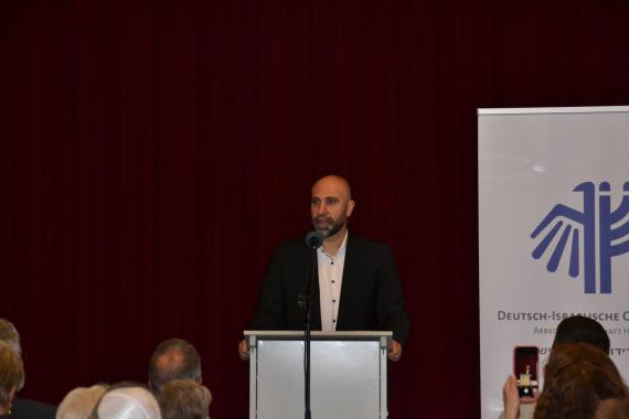Nach diesen Wortbeiträgen leitete Herr Ahmad Mansour seinen Impulsvortrag zuerst mit einer Einordnung seiner Person ein. Als Sohn arabischer Israelis erlebte er die Auswirkungen des Nahostkonfliktes schon früh als Kind und kam direkt in Berührung mit dem Thema: "Ich hatte keine Familie, die mir den Nahostkonflikt mit Büchern gezeigt haben, ich war mittendrin." Er habe schon durch seinen Vater Kontakt zu den sehr emotional aufgeladenen Seiten der Araber und wurde selbst auch während der Schulzeit, durch den Einfluss eines fundamentalistischen Lehrers, zu einem Islamisten. Aus heutiger Perspektive sieht er das Elend und die Zerstörung, die dieser Hass mit sich trägt, aber vor allem die Hoffnungslosigkeit auf Besserung, die ebenfalls durch den Hass einhergeht. Denn es sei, so Mansour, als Lösung des Konfliktes nur eine Zwei-Staaten-Lösung realistisch, welche derzeit unumsetzbar sei. Man müsse es schaffen, den aufgestachelten Lager mit Verständnis gegenüber ihre Situation zu begegnen, damit die feindschaftlichen Emotionen in einem gemeinsamen Dialog abgebaut werden können. Aus diesen Gründen hält er einen kritischen Austausch über die Lage der Beteiligten auch für sehr wichtig, sieht diesen, vermeintlich, kritischen Diskurs über Israel und Gaza allerdings als "entgleist" an, vor allem in den Sozialen Medien, aber auch im Alltag und auf der Straße. Viel zu oft würde diese Israel-Kritik als "Tarnung" genutzt, wie bei unzähligen Versammlungen und Protesten, um blanken Antisemitismus zu verbreiten, der mit jedweder sachlichen Kritik an z.B. Israels Regierung nichts mehr zutun habe und auch nicht an einem Dialog interessiert sei. Hier sieht Mansour auch die Bevölkerung in großer Bringschuld, da er beobachte, wie der öffentliche Raum immer stärker von Antisemiten dominiert würde, ohne, dass diese Repressalien zu fürchten müssten: "Heutzutage fühlt sich ein Islamist mit seiner Meinung hier in Deutschland sicherer als die Juden, die darunter leiden müssen." Insbesondere seit dem 7. Oktober 2023 führe die Hamas "die größte Social-Media-Kampagne der Geschichte, und diese ist einseitig." Mansour beobachte seitdem eine noch drastischere Entwicklung der antisemitischen Haltungen in Deutschland, aber auch in Europa generell. Er plädiert darausfolgend für die Schulung von Medienkompetenz, besonders im jungen Alter, da diese Gesellschaftsgruppe extrem anfällig für die Propaganda der Hamas sei. Auch die misslungene Integrationspolitik sehe er als Katalysator und fordert eine stärkere Einbindung von Migranten und deren Nachkommen in die Gesellschaft und die demokratischen Werte Deutschlands. Abschließend lenkt er den Fokus auch auf die Demokratisierung der palästinensischen Gebiete. Ohne diese notwendige Vorarbeit wären jegliche Friedens- und Einigungsbemühungen höchstens von kurzer Dauer und das resultierende Land instabil, was den Frieden im Nahen Osten weiterhin gefährden würde.