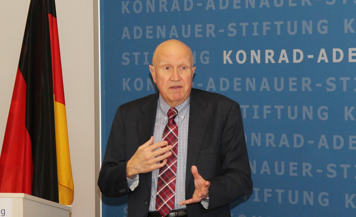 Professor Earl H. Fry (Brigham Young Universität, Ohio) erläuterte die Zusammenhänge zwischen dem TTIP Abkommen und den bevorstehenden Präsidentschaftswahlen in den Vereinigten Staaten. Der nordamerikanischen Wirtschaft ginge es gut, betonte Fry. Die Arbeitslosenquote sei niedrig, das Bruttoinlandsprodukt verzeichne Wachstum und doch herrsche bei vielen Menschen eine Unzufriedenheit mit dem bestehenden System - man meine, es wäre noch mehr möglich. Doch die Zahlen können nicht darüber hinwegtäuschen, dass „Schöpferische Zerstörung“ jeder ökonomischen Entwicklung innewohne. Fry beschrieb den boomenden technologischen Markt, der noch nie dagewesenen Veränderungen unterlege und gleichzeitig Arbeitsplätze schaffe, aber auch streichen müsse. Diese Veränderungen schaffen Unsicherheit bei der Bevölkerung. Sie könne zudem die Bedeutung von Globalisierung nicht erfassen und sehe sie demnach als Bedrohung an. Auch Donald Trump suche die Schuld des Übels in der Globalisierung der Welt und China. Diese seien verantwortlich und die Vereinigten Staaten nur ihr Opfer. Diese Ansicht werde von der Mehrheit der amerikanischen Bevölkerung geteilt.