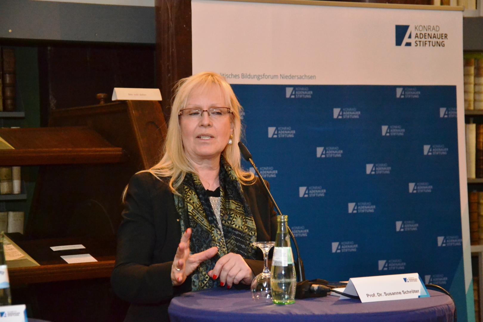 Die Ethnologin Susanne Schröter stellte einleitend fest, dass der Islam sich schrittweise als europäische Religion etabliere und sich islamische Organisationen in der Gesellschaft relevanter würden.Seit Beginn des 21. Jahrhunderts fände gleichzeitig eine Ausbreitung des islamischen Fundamentalismus statt. Dies spiegele sich in den zahlreichen Konflikten unserer Welt wider. Ob terroristische Anschläge, Morde oder Übergriffe auf Frauen ohne Kopftuch. Von China bis nach Marokko sei ein Anstieg des islamischen Fundamentalismus spürbar. Diese Entwicklung erfordere eine neue Auseinandersetzung mit unserer normativen Ordnung. Die Menschen müssten lernen, welche Werte in Deutschland als allgemeinverbindlich gelten.