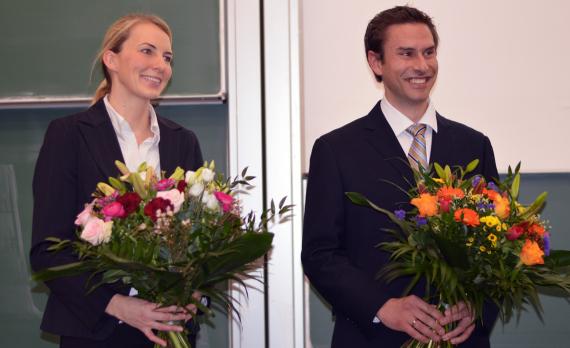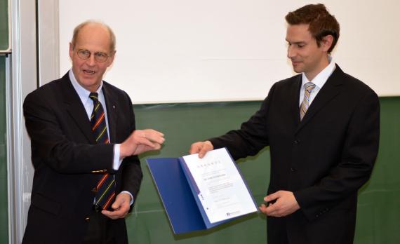 Dr. Dirk Steinhilber erhält den Bruno-Heck-Wissenschaftspreis für seine Dissertation zur Synthese von bioresponsiven Nano- und Mikrogelen zur Verkapselung von Proteinen und Zellen und deren späterer kontrollierter Freisetzung. Seine biomedizinischen Forschungen bedeuten einen Durchbruch für die regenerative Zelltherapie, ihr gesellschaftspolitischer Beitrag liegt in ihrem „Anwendungsbezug“, so die Jury. Die von Steinhilber entwickelten Nanotransporter können beispielsweise selektiv in Tumorgewebe aufgenommen werden und dort wirken. Steinhilbers Forschung bildet damit die Grundlage für biochemische Anwendungen bei Krankheiten wie Diabetes, Krebs und Alzheimer.