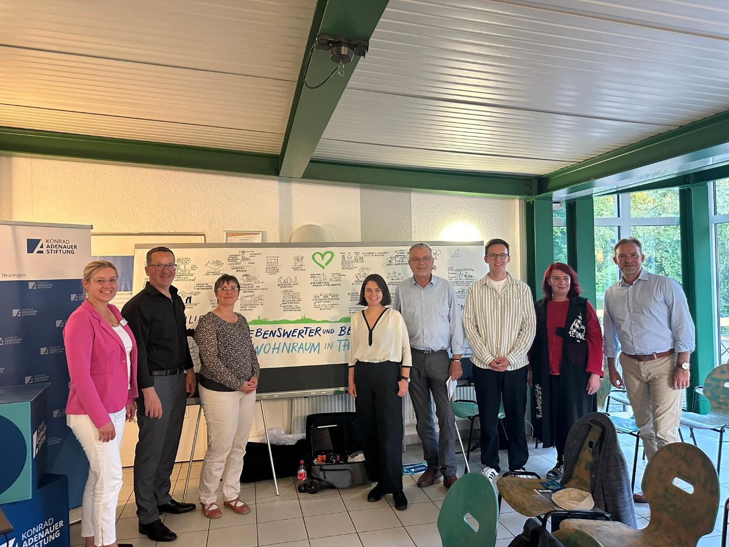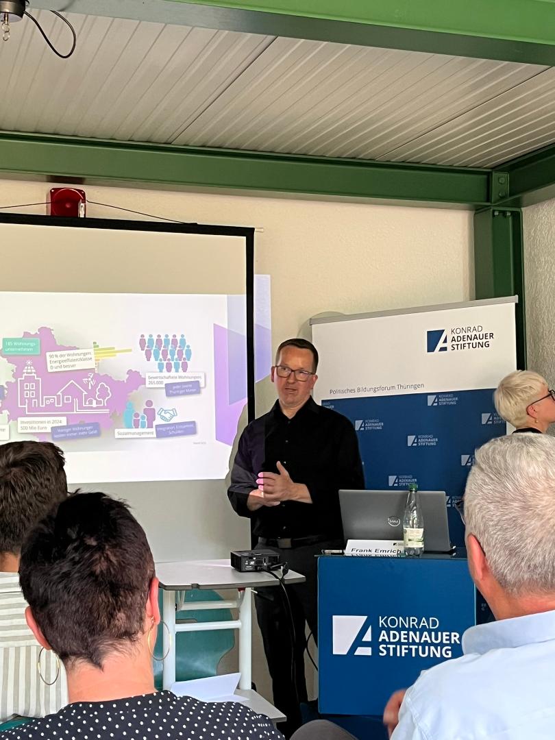 „Wohnen betrifft uns alle! – und gerade im ländlichen Raum entscheidet sich, wie wir als Gesellschaft in Zukunft leben wollen. Ilmenau ist hierfür ein wunderbares Bsp. - Wir sehen - Ländliche Räume sind mehr als Wohnorte: Sie sind Heimat für Familien, Rückzugsorte für ideenreiche junge Menschen und Standorte für (Hoch)schulen und Unternehmen, die engagierte Fachkräfte ausbilden und darauf angewiesen sind.“, so Maja Eib, Landesbeauftragte der Konrad-Adenauer-Stiftung Thüringen, in ihren begrüßenden Worten und lud dazu ein über die Potenziale für Familien, die größeren Wohnraum suchen, für junge Menschen mit Gestaltungswillen und Fachkräfte, die bleiben oder zurückkehren würden zu sprechen, wenn es gelingt die harten und weichen Standortfaktoren schaffen, die Familien benötigen.