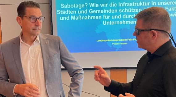 "Wir sind nicht im Krieg, aber auch nicht im Frieden. Wenn Züge, Schiffe, Seekabel und Bahnstrecken angegriffen werden, führen die Spuren häufig nach Russland." Felix Paschek (links) im Gespräch mit Jörg Dreger