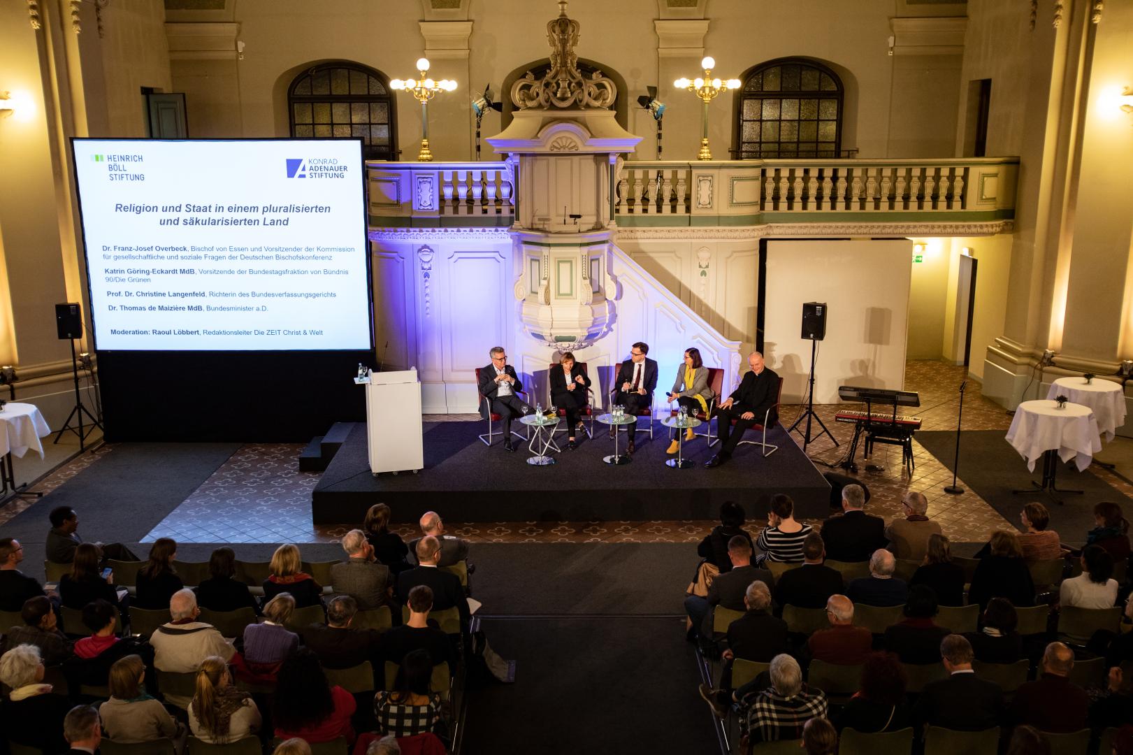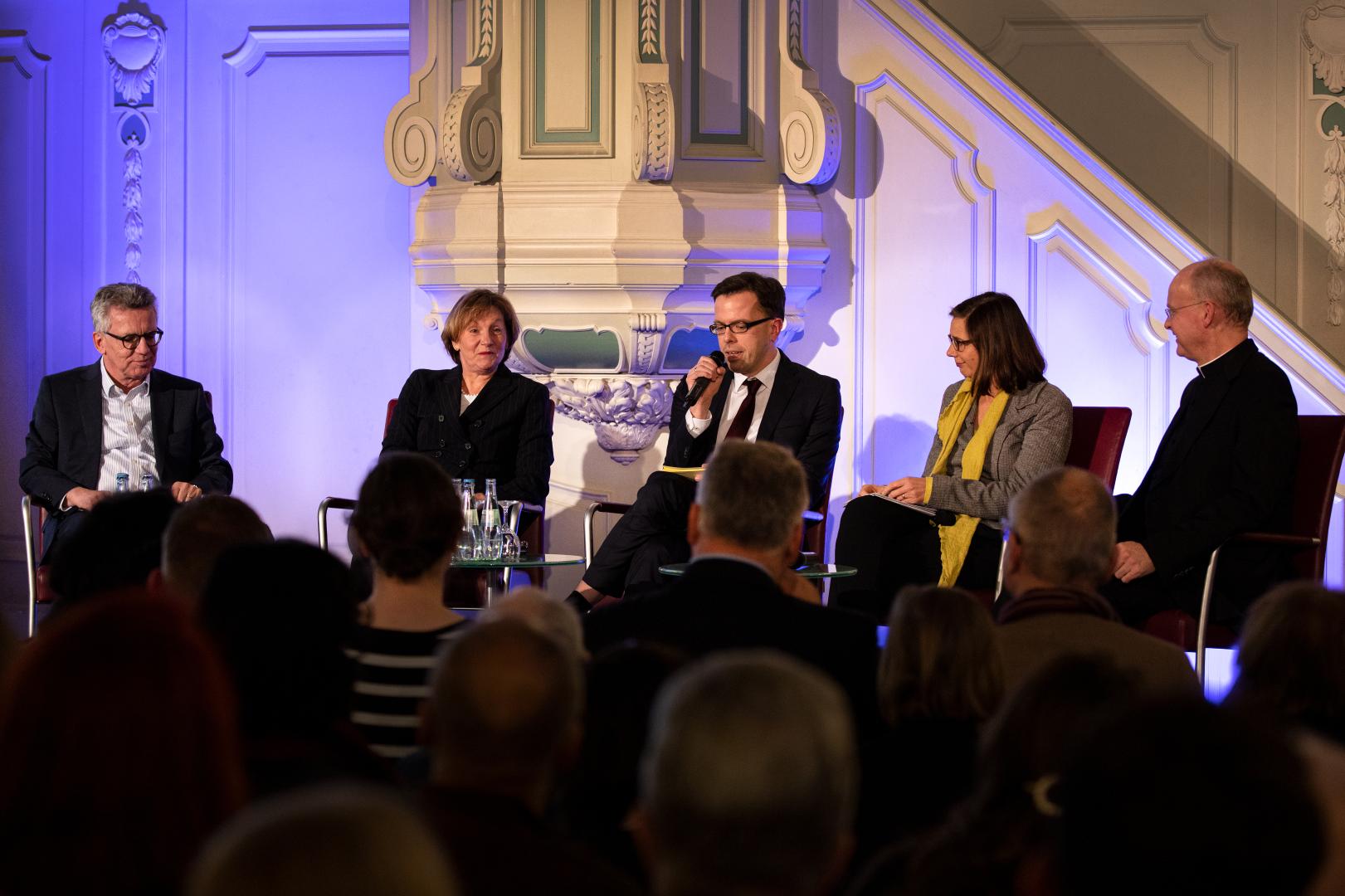 Wie sich das Verhältnis von Staat und Religion angesichts sich verändernder gesellschaftlicher Rahmenbedingungen heute fassen lässt und wie darauf zu reagieren ist, darüber diskutierten im Anschluss Dr. Franz-Josef Overbeck, Vorsitzender der Kommission für gesellschaftliche und soziale Fragen der Deutschen Bischofskonferenz und Bischof von Essen, Katrin Göring-Eckard, MdB, Vorsitzende der Bundestagsfraktion von Bündnis 90/Die Grünen, Prof. Dr. Christine Langenfeld, Richterin des Bundesverfassungsgerichts, und Dr. Thomas de Maizière, MdB, Bundesminister a.D.